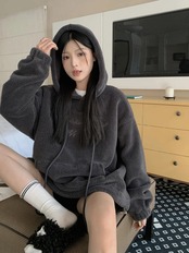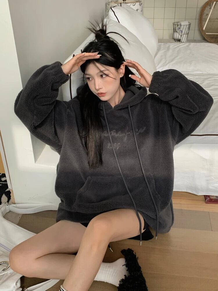 レター刺繍肥厚フード付きトレーナー秋/冬ルーズミディアム丈プルオーバー オータム 秋物 ウィンター 冬物