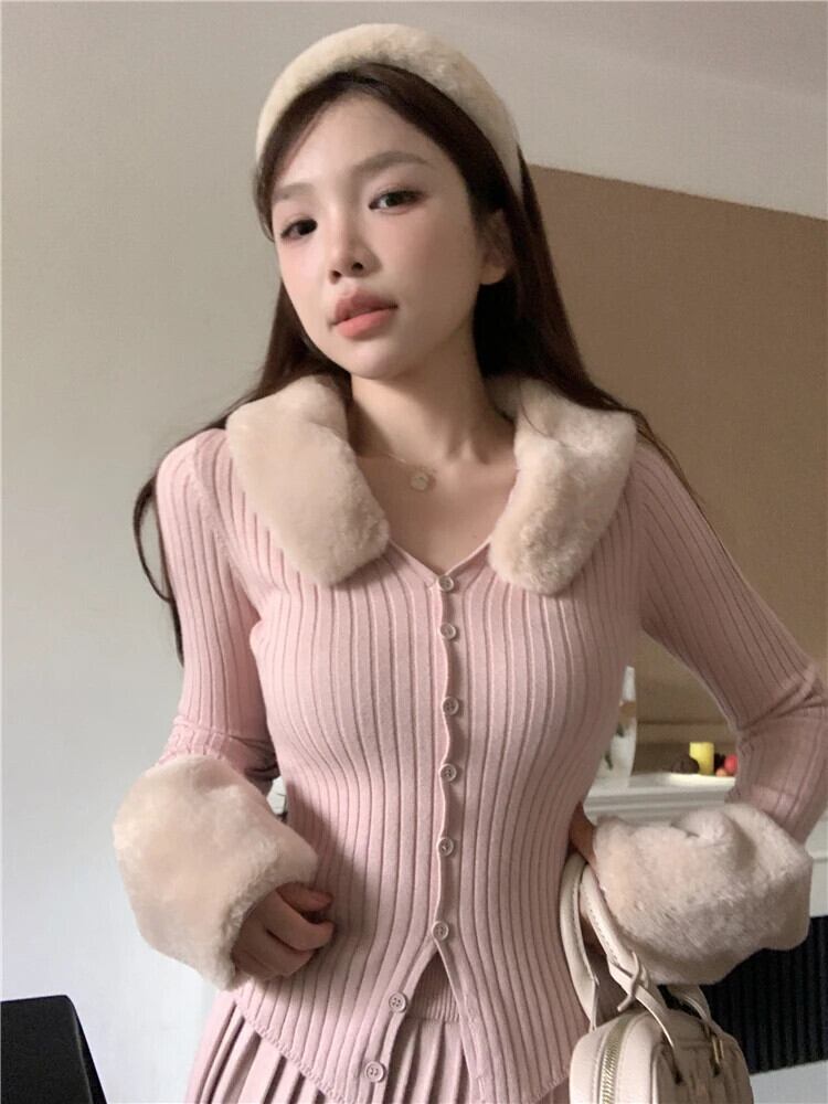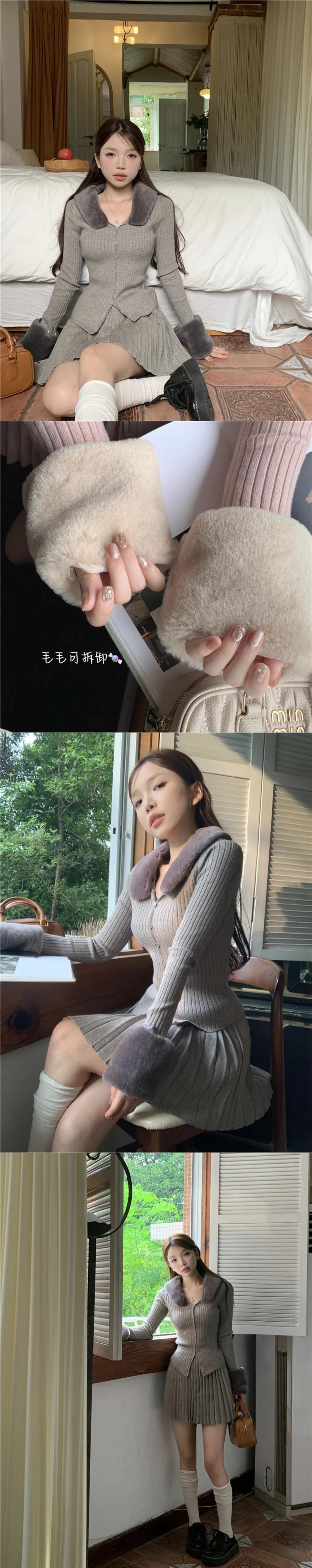 Sweet Girl スーツ レディース 秋冬 ファー襟 長袖 ニット カーディガン プリーツ ショートスカート 2点セット ロング 大人ガーリー スウィート キュート カジュアル オータム 秋物 ウィンター 冬物