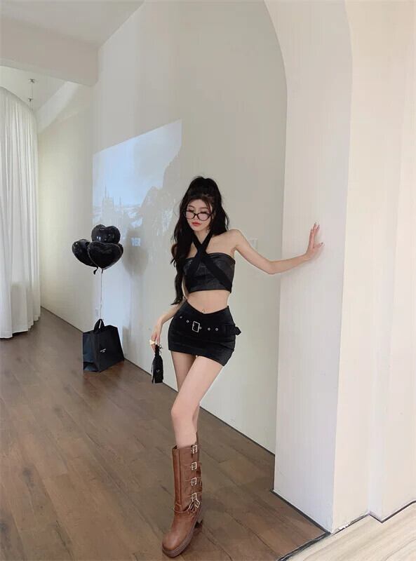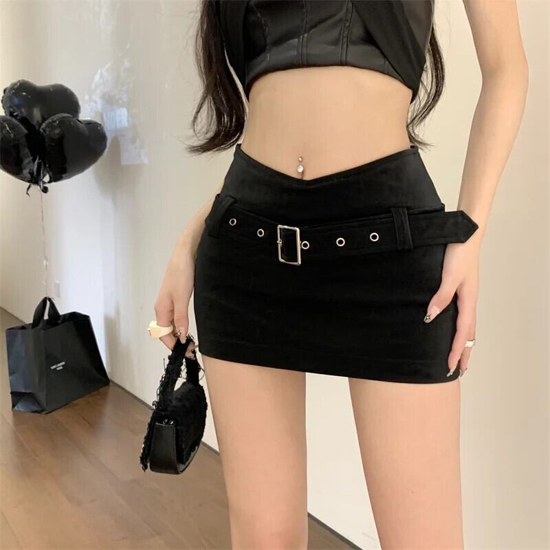 セクシースパイシーガール A ラインラップヒップ PU ショートスカート秋/冬アメリカンベルト黒ミニスカート ブラック オータム 秋物 ウィンター 冬物 ハーネス Aライン