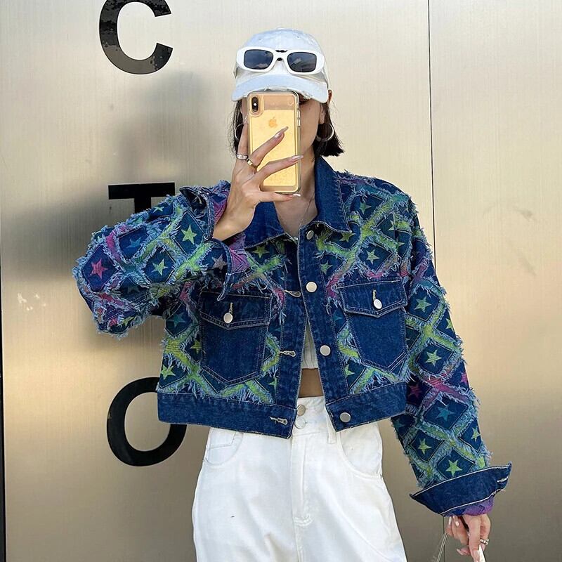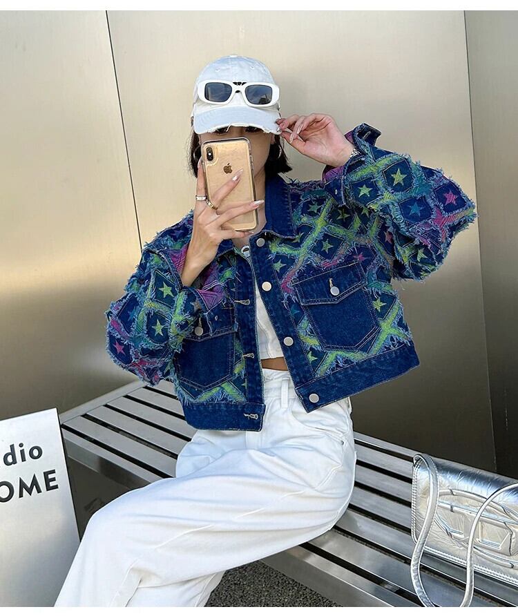 パッチワークデニムジャケット秋ジャケット多用途ショートダイヤモンドチェックジャケットトップ レッド オータム 秋物