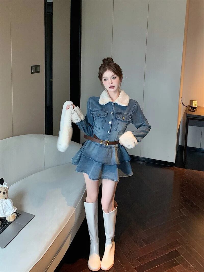甘いガールレトロパッチワーク豪華デニムドレス秋/冬スリムフィットラペル長袖 A ラインショートドレス ロング 大人ガーリー スウィート キュート カジュアル オータム 秋物 ウィンター 冬物 Aライン