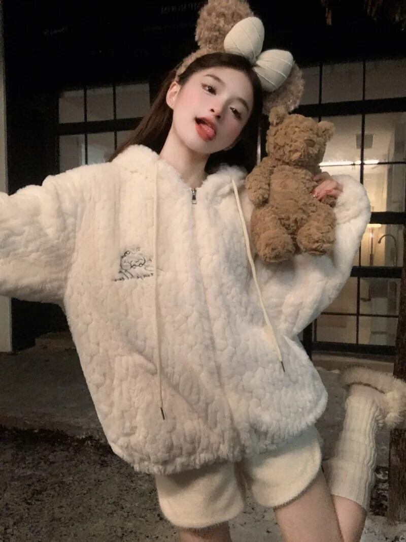 甘いホットガール毛皮ようかわいいウサギ耳豪華ジャケット冬フード付きルーズコットンスウェットシャツ 大人ガーリー スウィート キュート カジュアル ウィンター 冬物