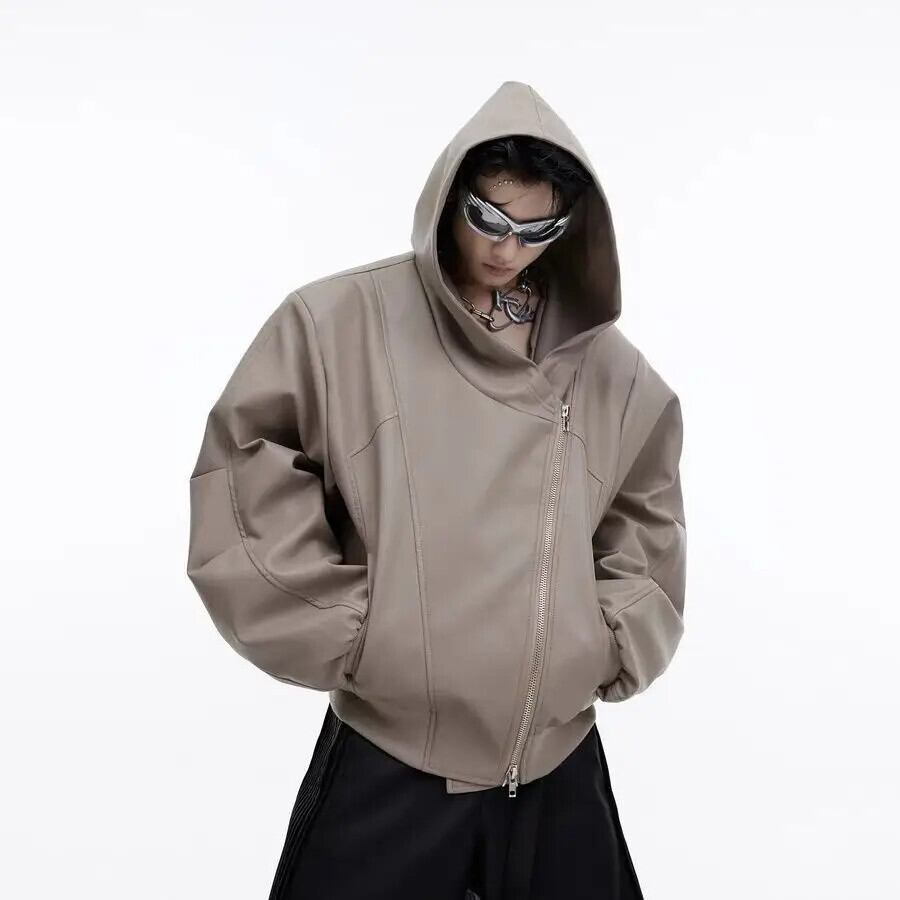 クールボーイジッパーフード付き Pu レザージャケットメンズ秋/冬ストリートルーズカーブスリーブショートコート男性 オータム 秋物 ウィンター 冬物