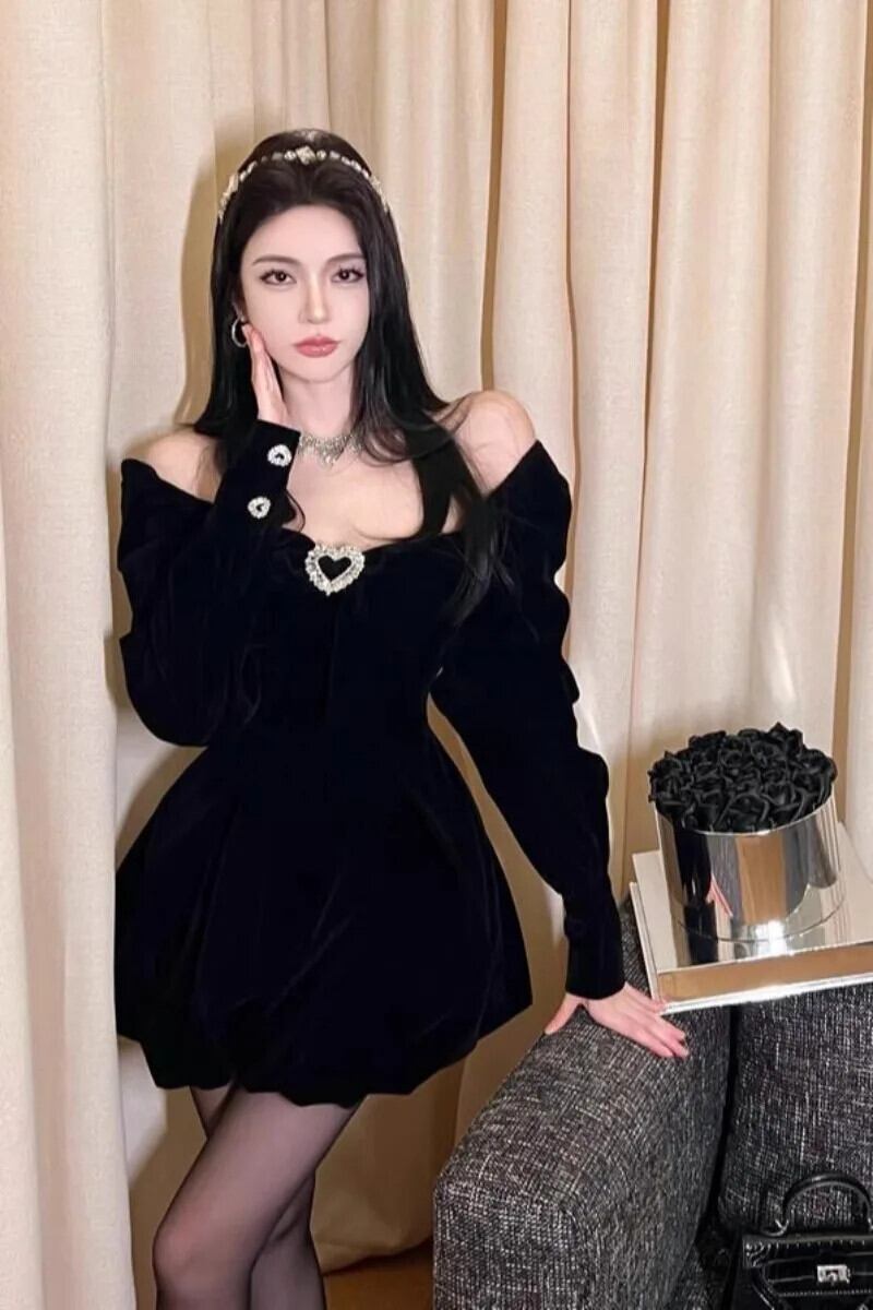 フレンチスクエアカラー純粋セクシー弓植毛長袖ジャンプスーツ秋黒エンドフェイクドレス ロング ブラック リボン オータム 秋物 ピュア スクウェア