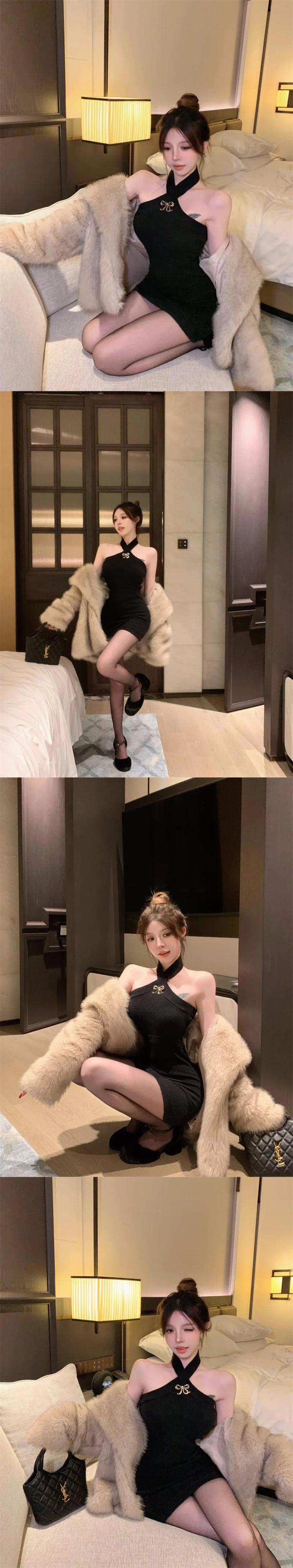 アメリカンスタイルホットガール純粋セクシーホルターネックニットドレス秋スリムフィットラップヒップショートドレス オータム 秋物 ピュア