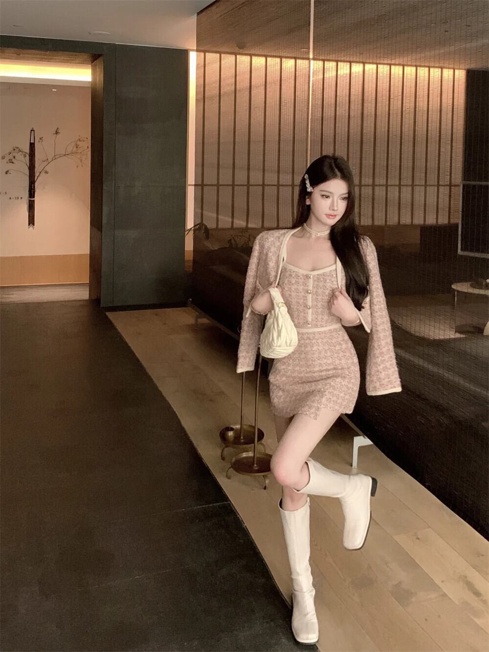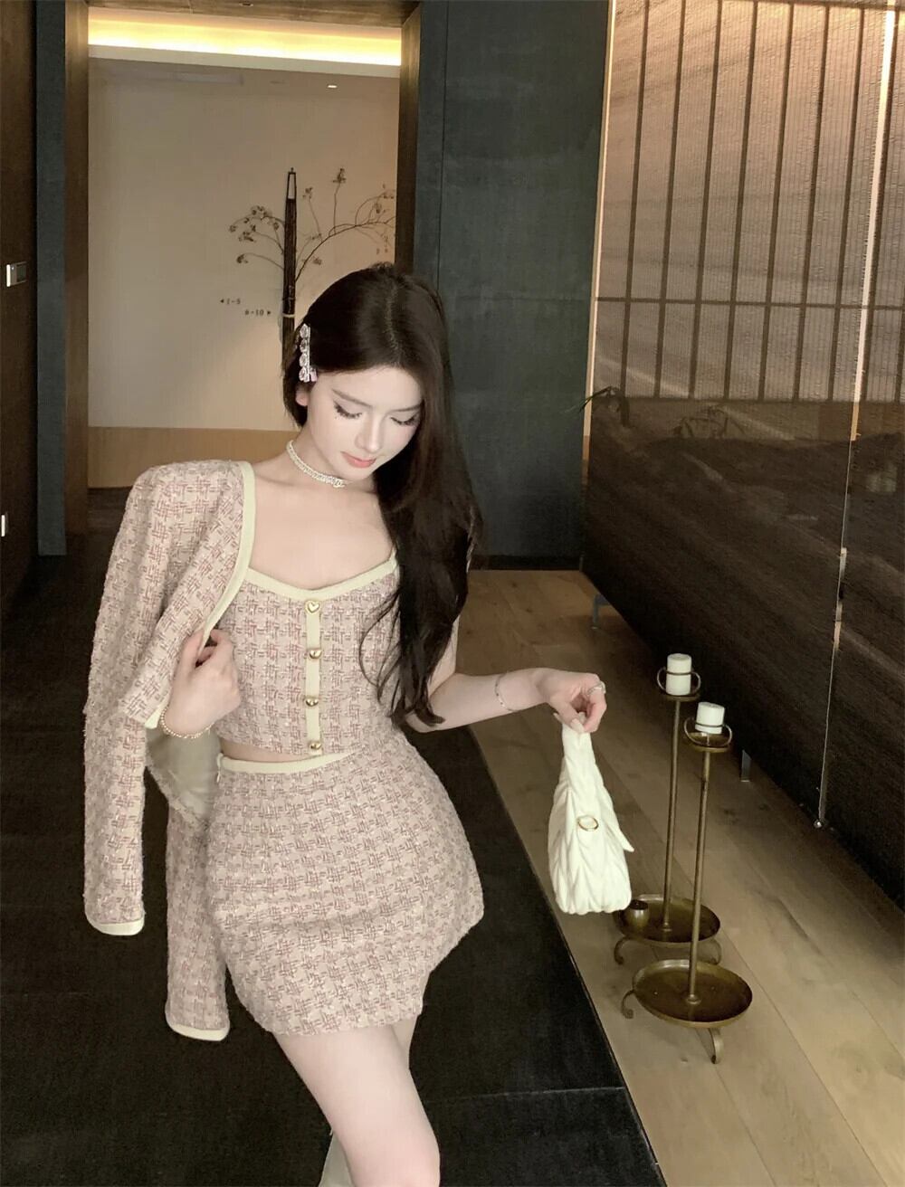 フレンチスイートホットガールスーツ秋/冬チェック柄ツイードコートウエストミニスカートキャミソール3点セット 大人ガーリー スウィート キュート カジュアル オータム 秋物 ウィンター 冬物