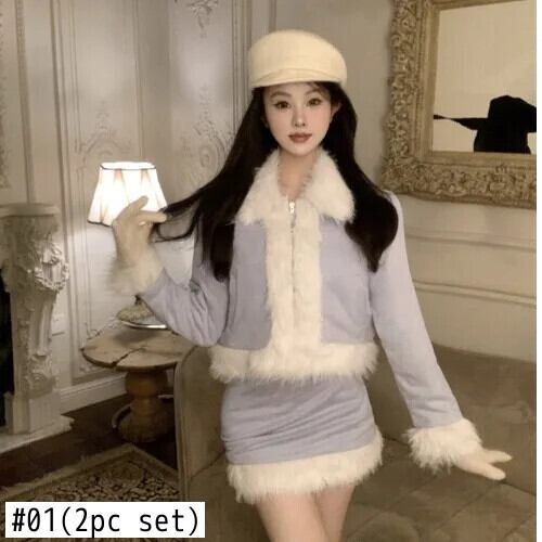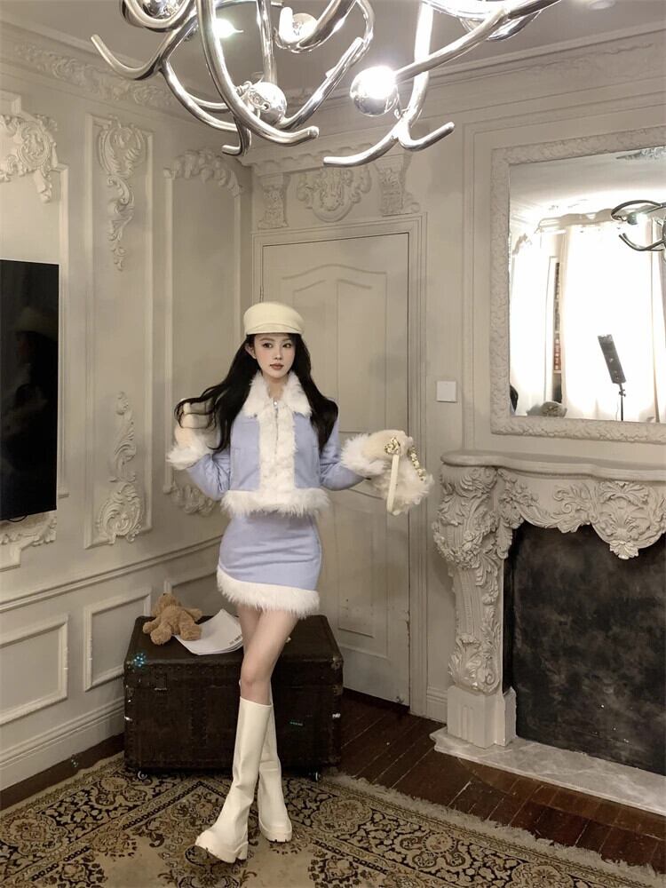 スイートホットガールスーツ レディース 秋冬 ファーパッチワーク 長袖ジャケット ウエストミニスカート 2点セット ロング 大人ガーリー スウィート キュート カジュアル オータム 秋物 ウィンター 冬物