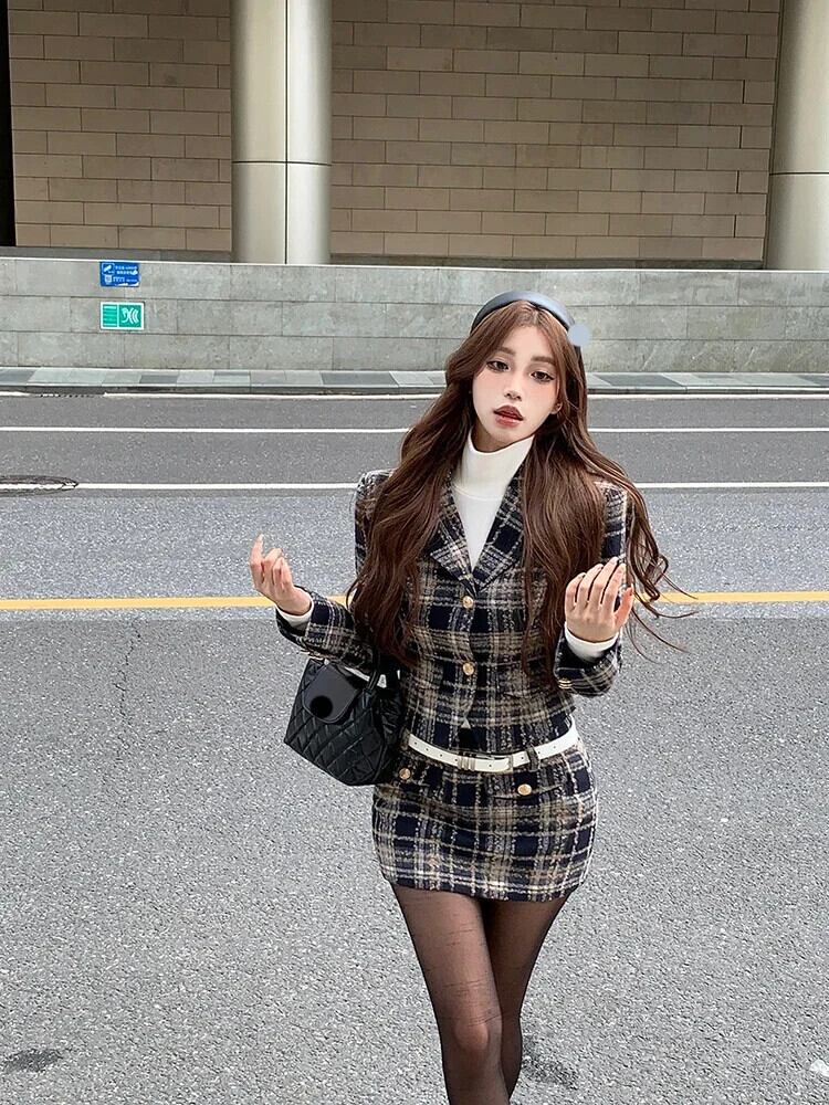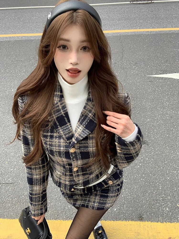 Sweet Girl プレッピー スタイル スーツ レディース 秋冬 ラペル スリム フィット チェック柄 コート ウエスト ミニ スカート 2 点セット 大人ガーリー スウィート キュート カジュアル オータム 秋物 ウィンター 冬物