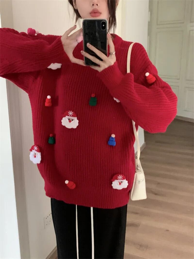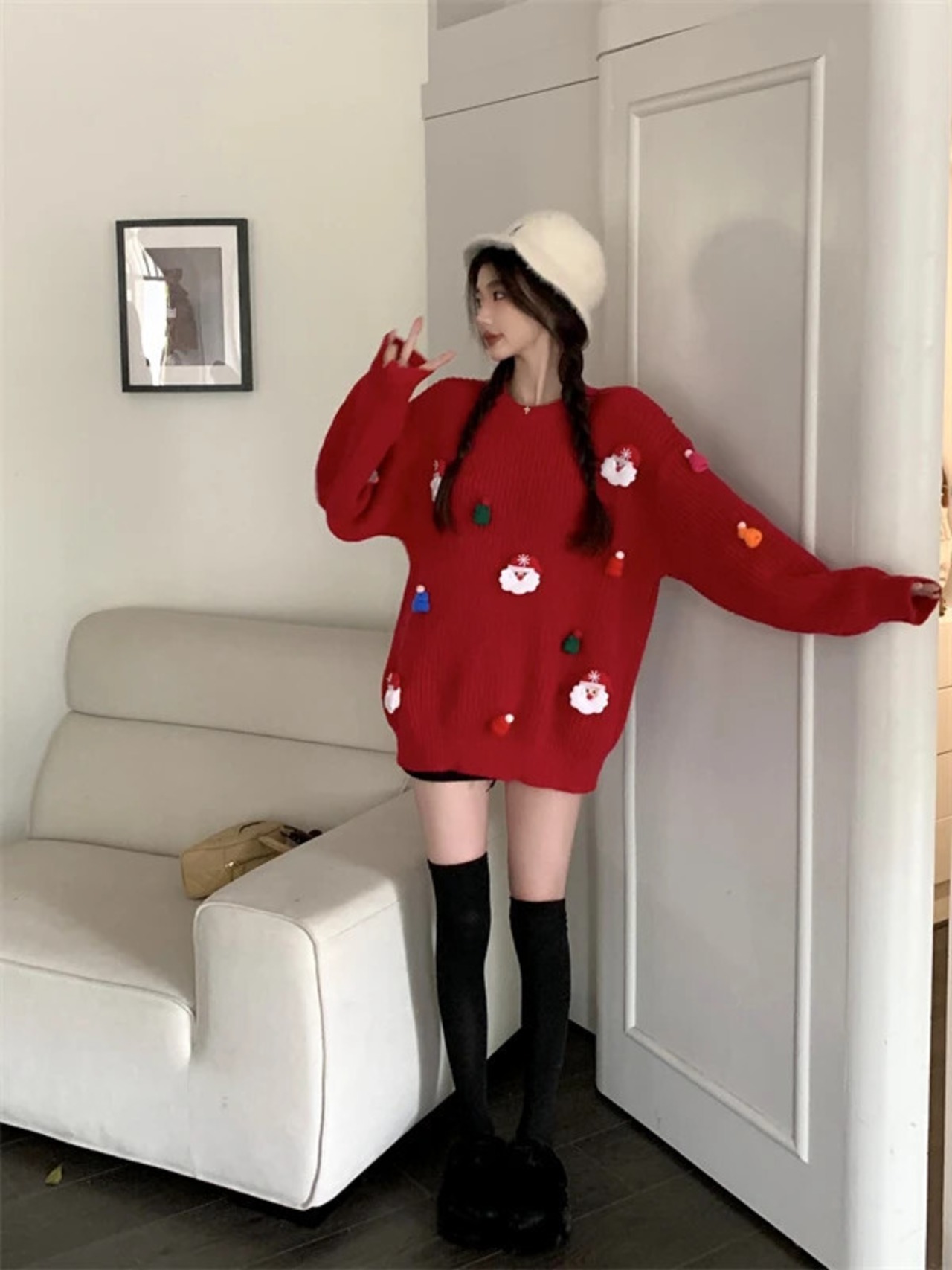 3D クリスマス装飾赤セーター秋/冬ルーズ長袖 O ネックニットプルオーバー ロング レッド オータム 秋物 ウィンター 冬物 Oネック