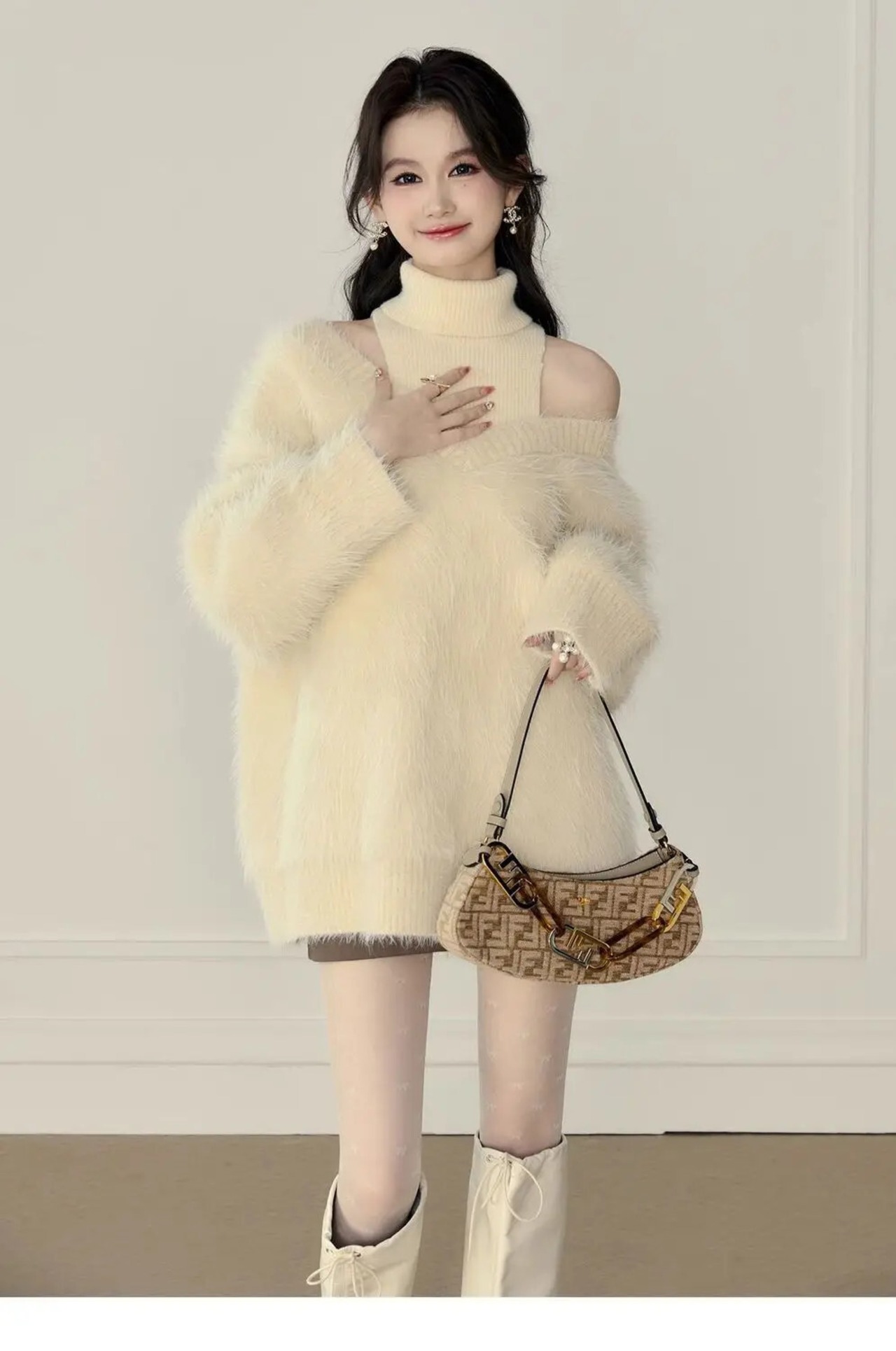 Sweet Girl オフショルダーフェイク 2 ピースルーズセーター秋/冬ネック長袖ニットプルオーバー ロング 大人ガーリー スウィート キュート カジュアル オータム 秋物 ウィンター 冬物