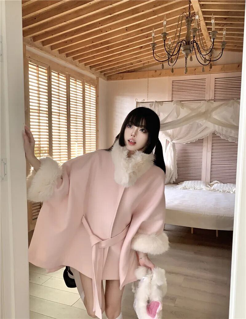 甘いガールルースレースアップウールコート秋/冬長袖毛皮襟ピンクマントショートコート Femlae ロング 大人ガーリー スウィート キュート カジュアル オータム 秋物 ウィンター 冬物