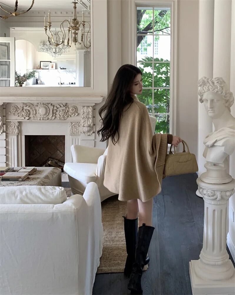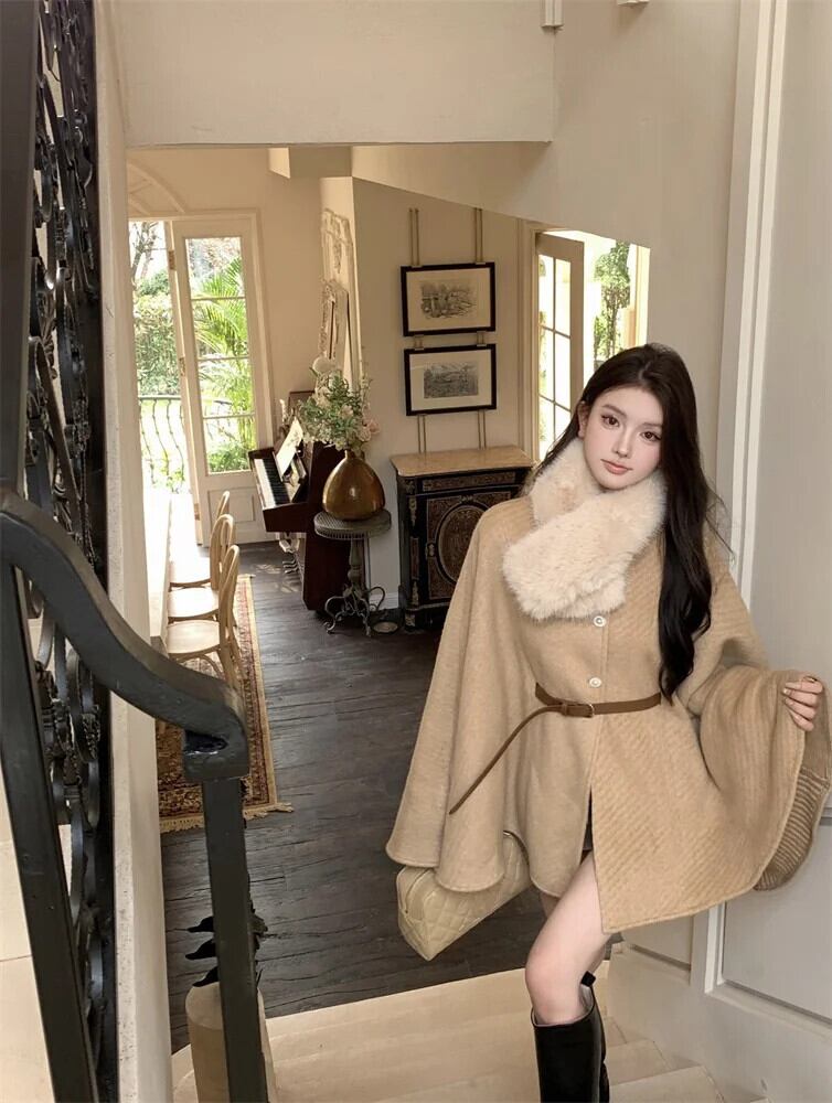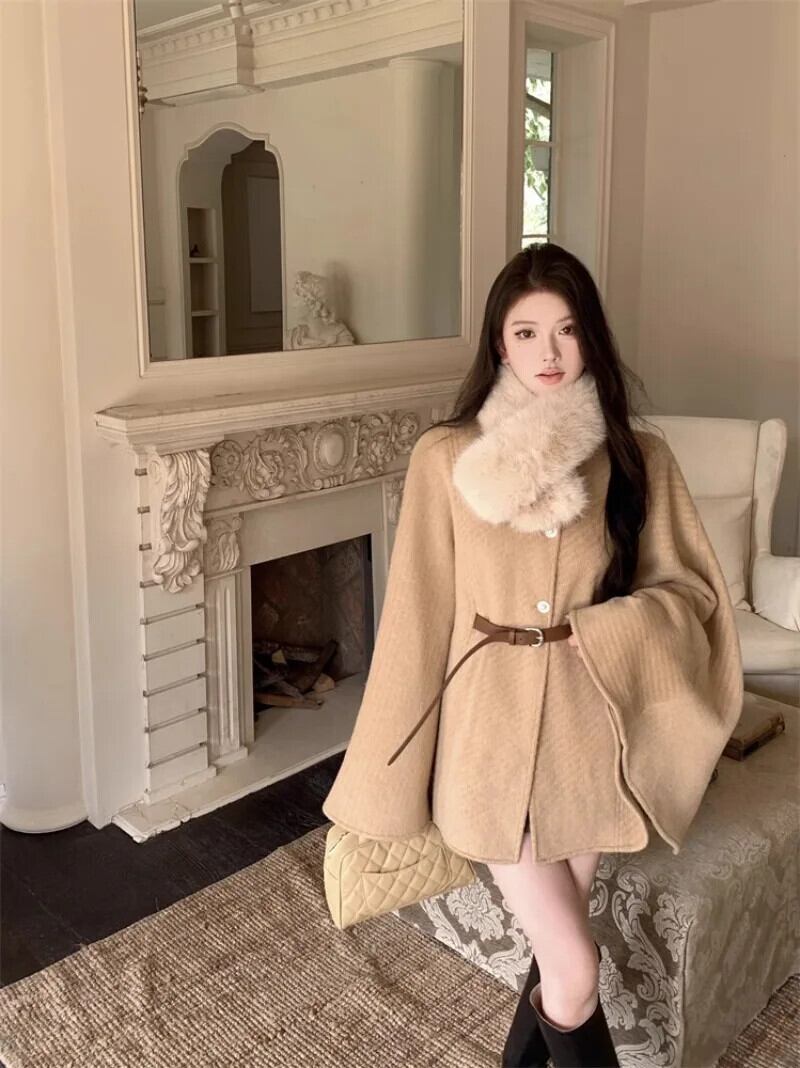 甘いホットガール毛皮襟レースアップケープコート冬ルーズミッドレングスウエストバンドジャケット 大人ガーリー スウィート キュート カジュアル ウィンター 冬物