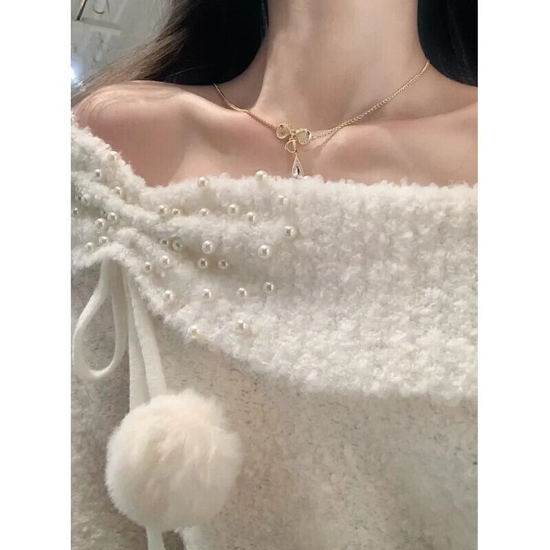 Sweet Girl ビーズオフショルダーレースアップボールセーター秋/冬優しいルーズニットプルオーバー 大人ガーリー スウィート キュート カジュアル オータム 秋物 ウィンター 冬物