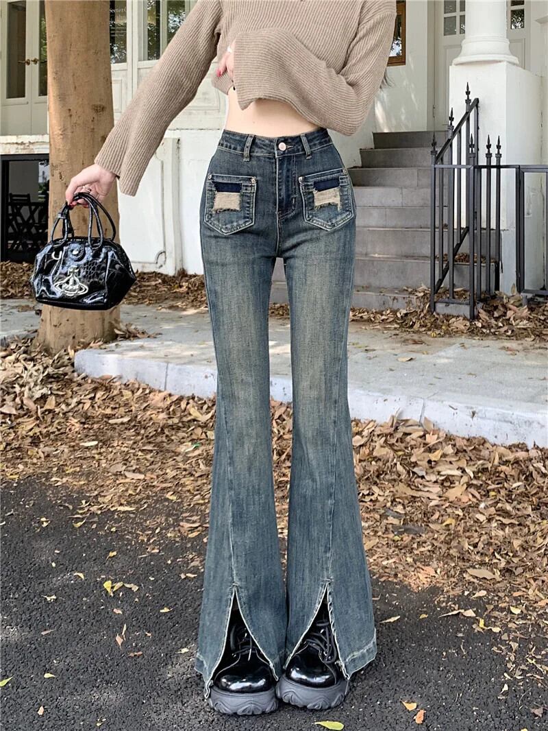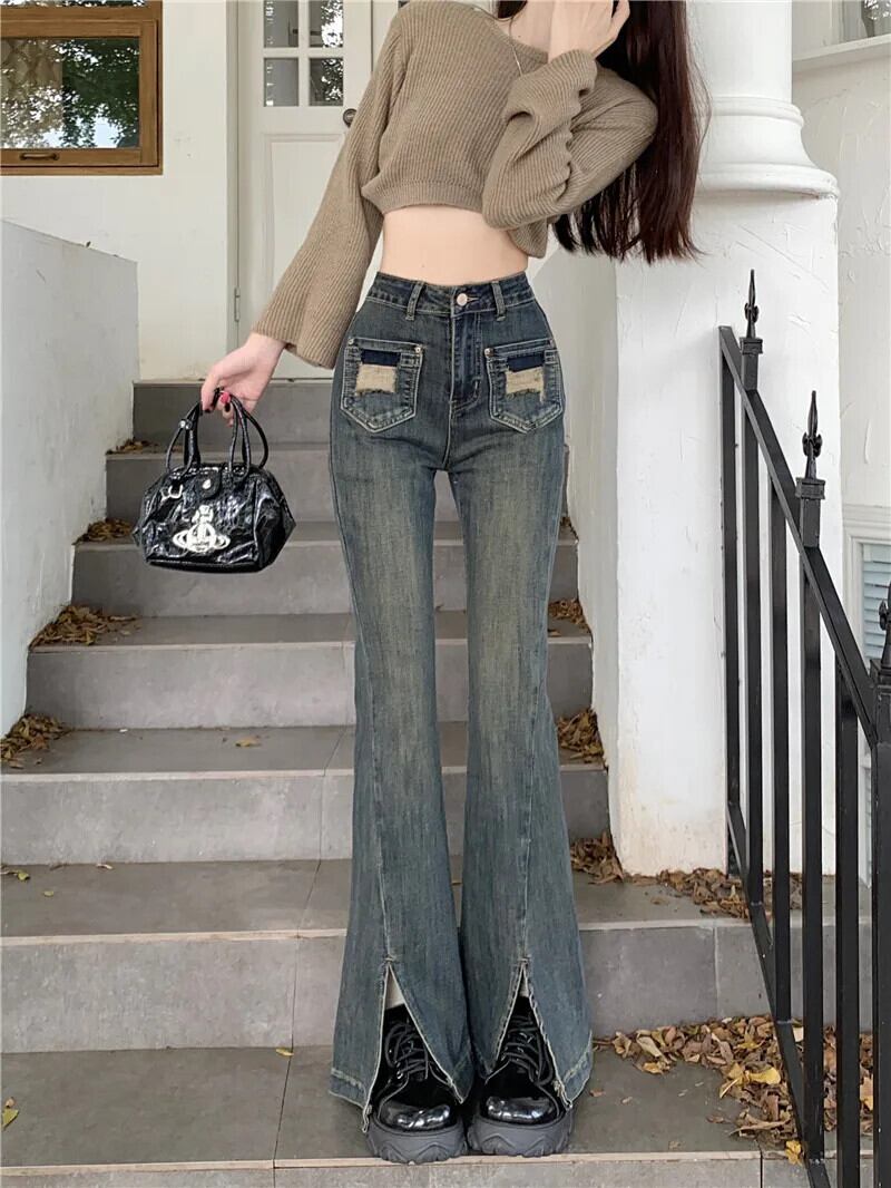 甘いホットガール香港スタイルフレアジーンズ秋ウエストマイクロフレアスプリットパンツ レッド 大人ガーリー スウィート キュート カジュアル オータム 秋物