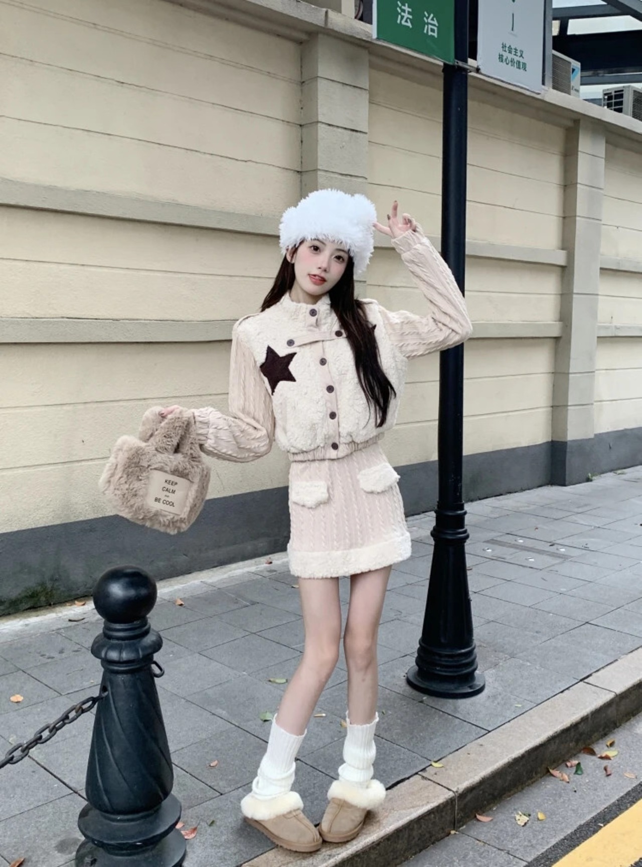 甘いホットガールスーツ秋スタンドカラー豪華コートウエスト A ラインショートスカート 2 点セット 大人ガーリー スウィート キュート カジュアル オータム 秋物 Aライン