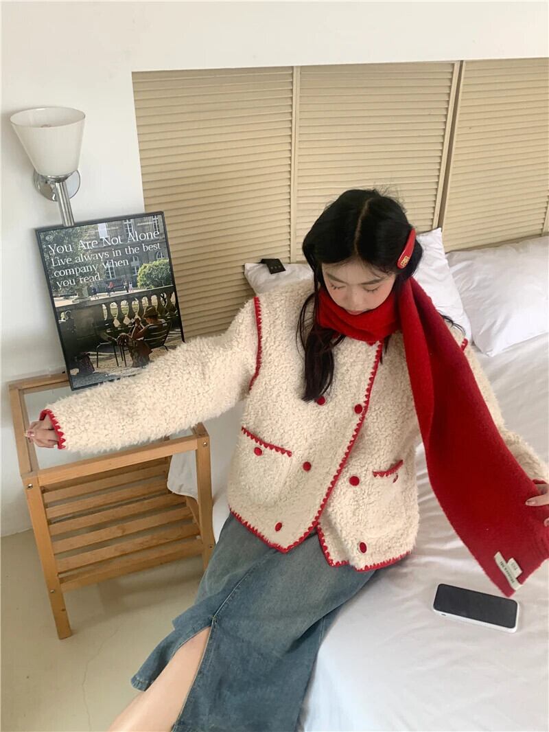 甘いホットガールパッチワークダブルブレストジャケット冬ルーズフィット暖かいラムウールコート 大人ガーリー スウィート キュート カジュアル ウィンター 冬物