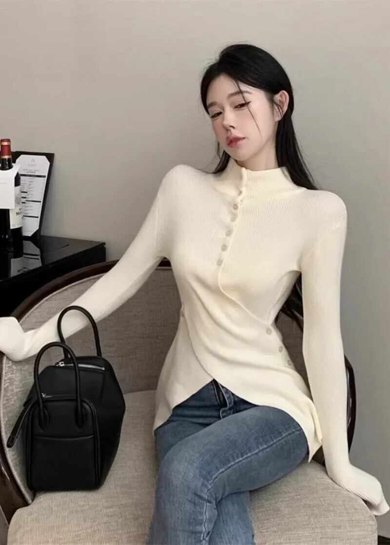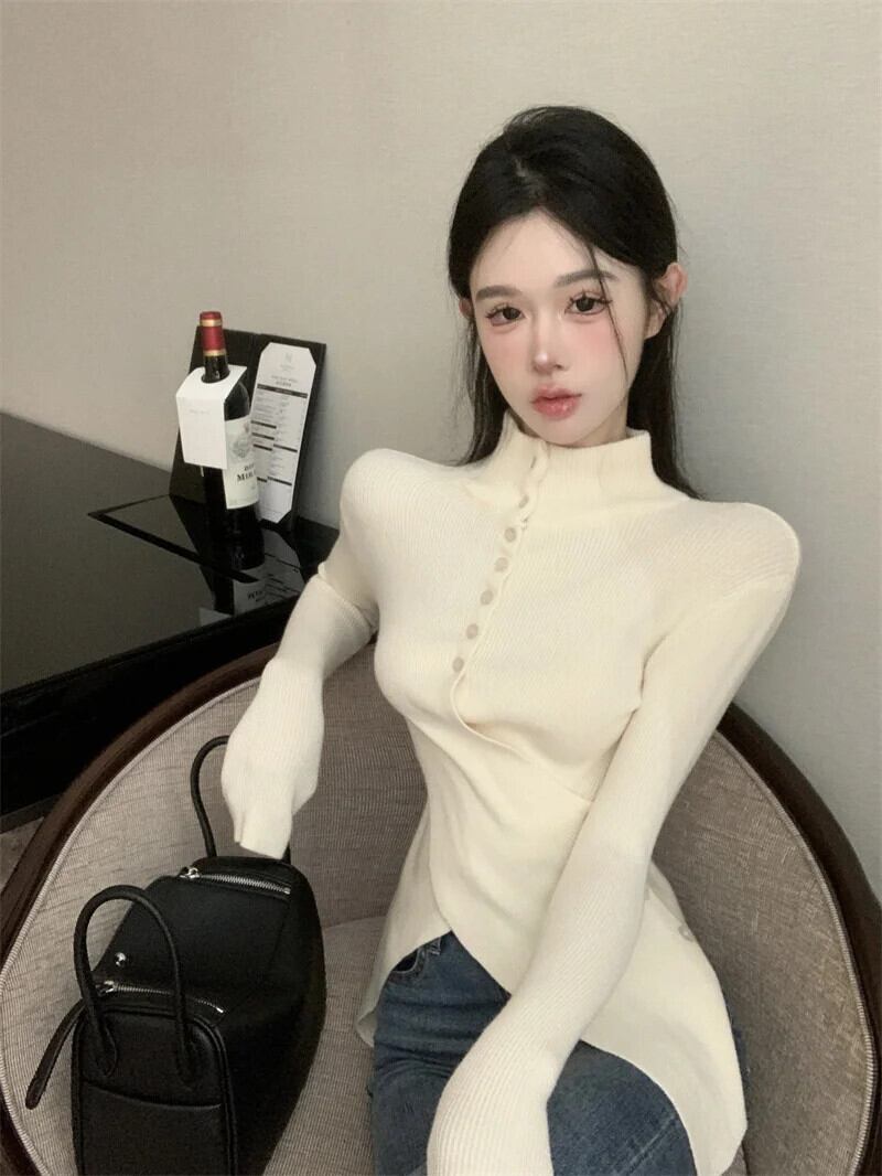 純粋セクシーホットガール不規則ソリッドカラーセーター秋/冬ネックスリムフィットボトムニットプルオーバー オータム 秋物 ウィンター 冬物