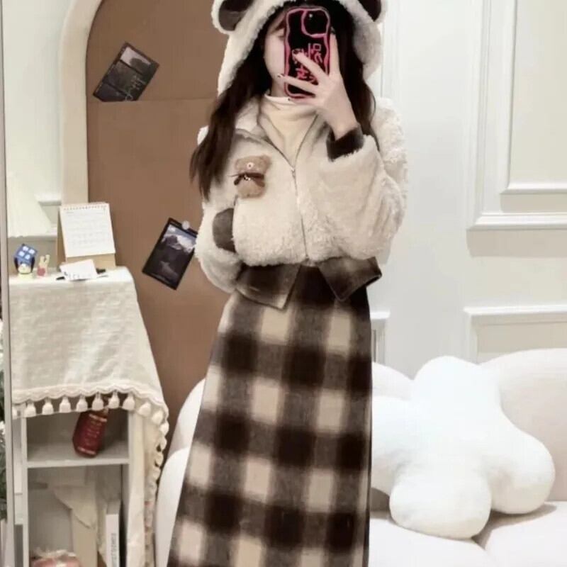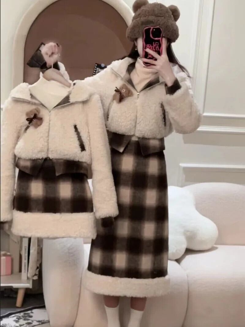 スイートガールスタイルスーツ秋豪華フード付きショートコートチェック柄ラップヒップスカートツーピースセット 大人ガーリー スウィート キュート カジュアル オータム 秋物