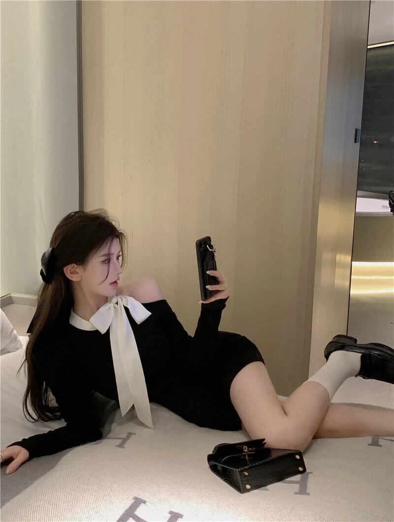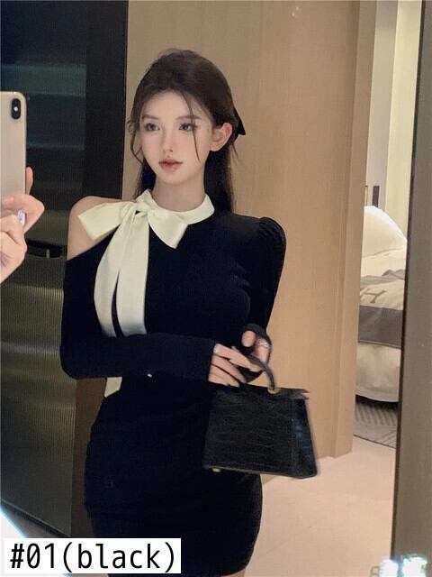 甘いホットガール黒ニットドレス秋 O ネック長袖レースオフショルダードレス ロング ブラック 大人ガーリー スウィート キュート カジュアル オータム 秋物 Oネック
