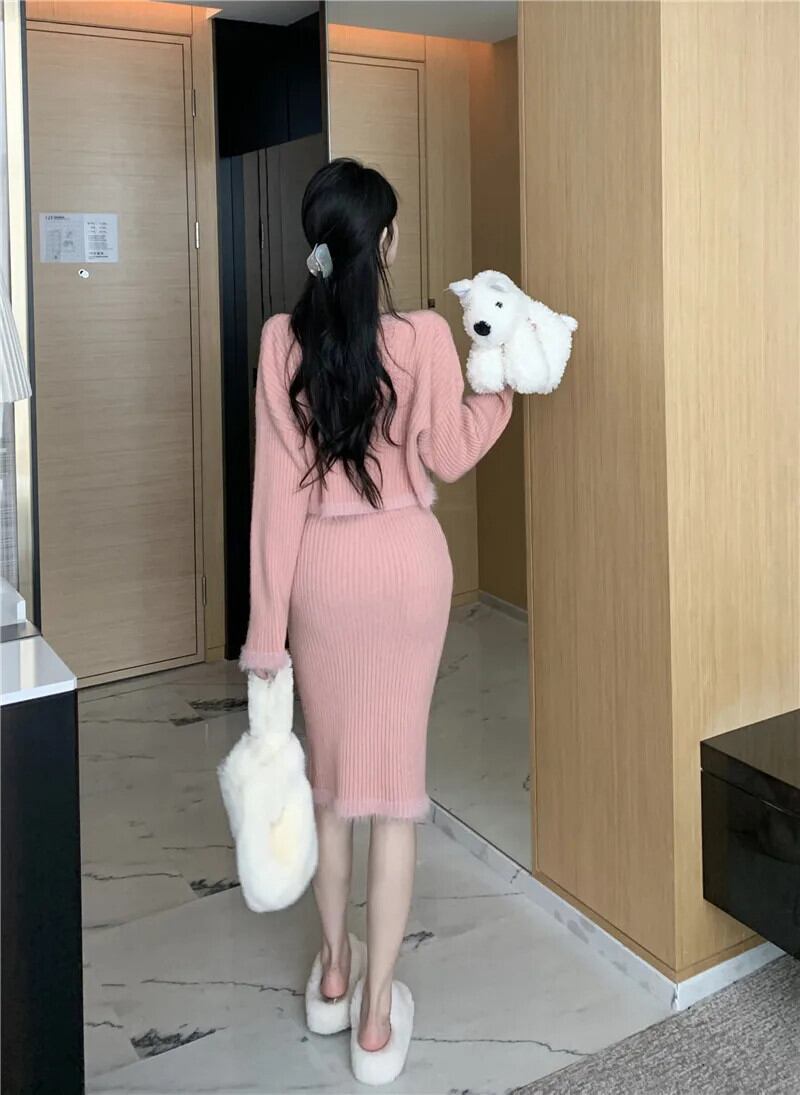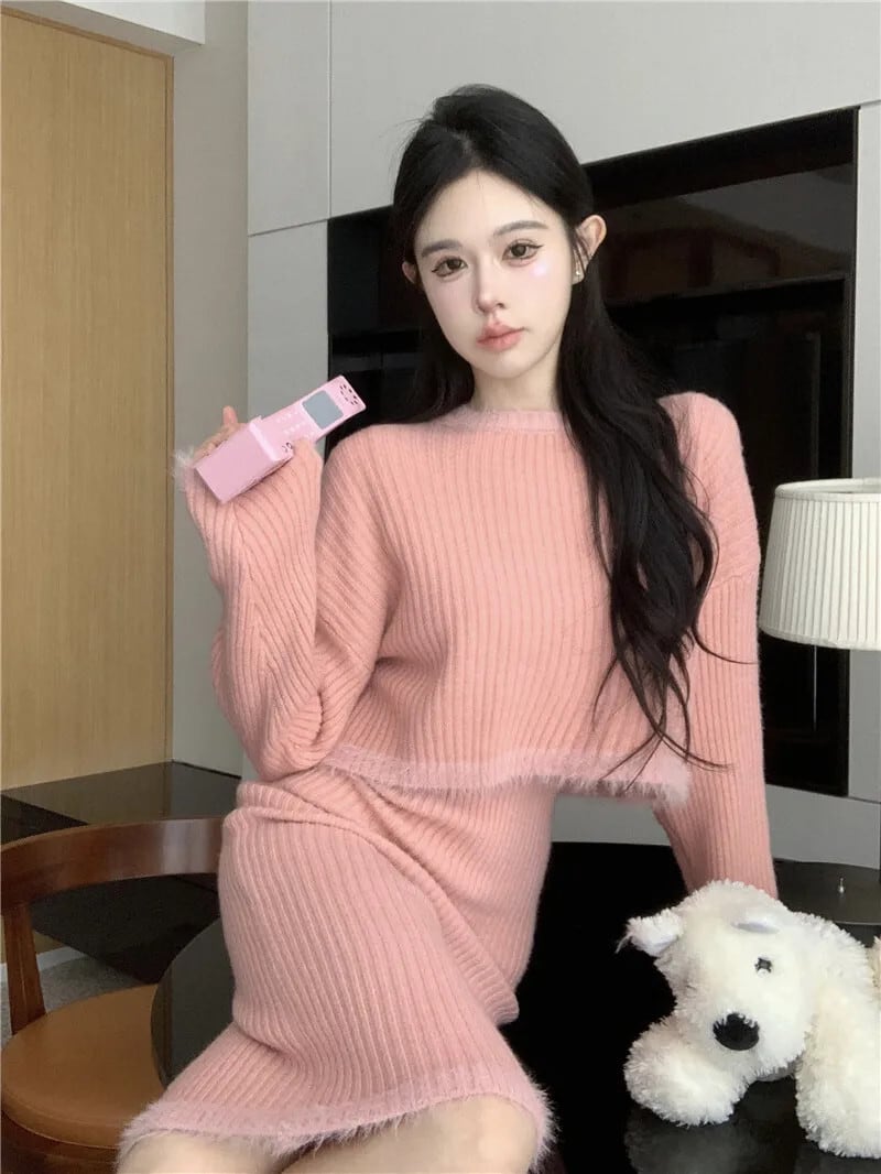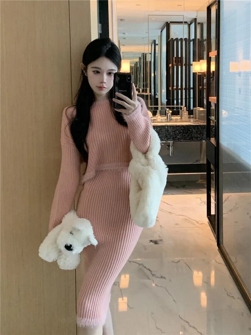 Sweet Girl ニットスーツ レディース 秋 ラウンドネック 長袖セーター ラップヒップスカート 2点セット ロング 大人ガーリー スウィート キュート カジュアル オータム 秋物 Oネック