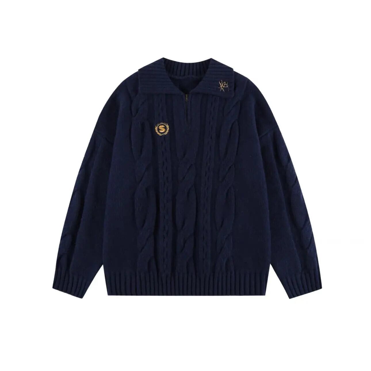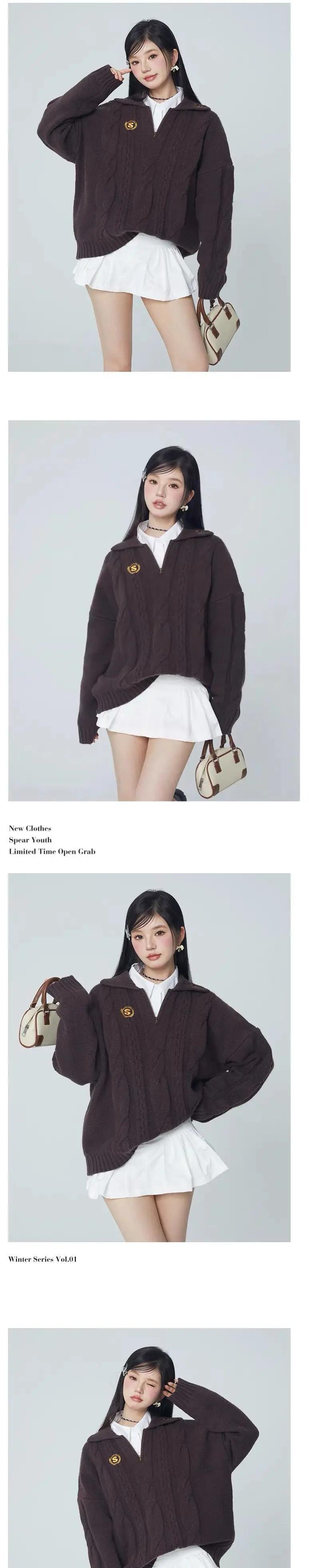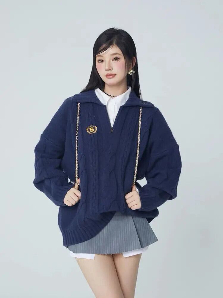 ホットガールアメリカンスタイルツイストセーター秋と冬ルーズ長袖ジッパーラペルニットプルオーバートップ ロング オータム 秋物 ウィンター 冬物
