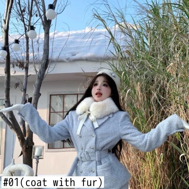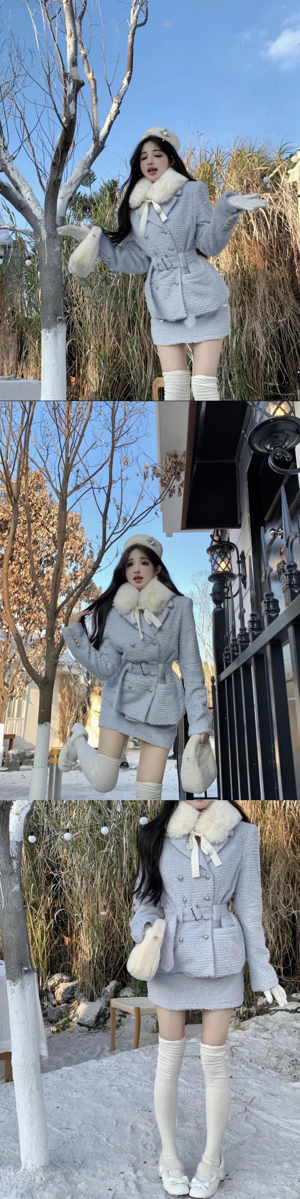 スイートガールスーツ秋/冬豪華毛皮襟スリムフィットコートウエストミニスカートツーピースセット 大人ガーリー スウィート キュート カジュアル オータム 秋物 ウィンター 冬物