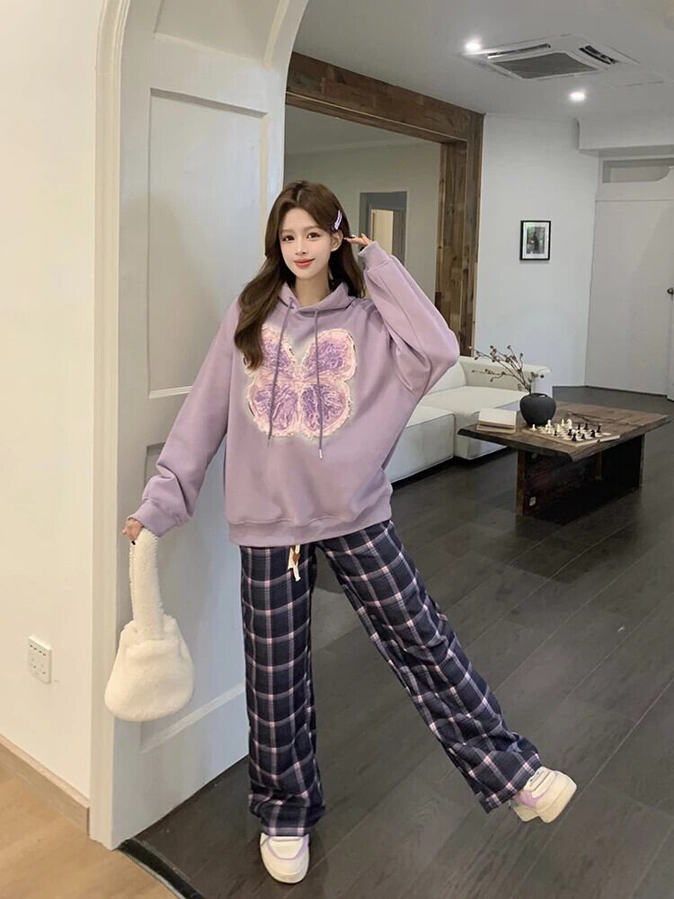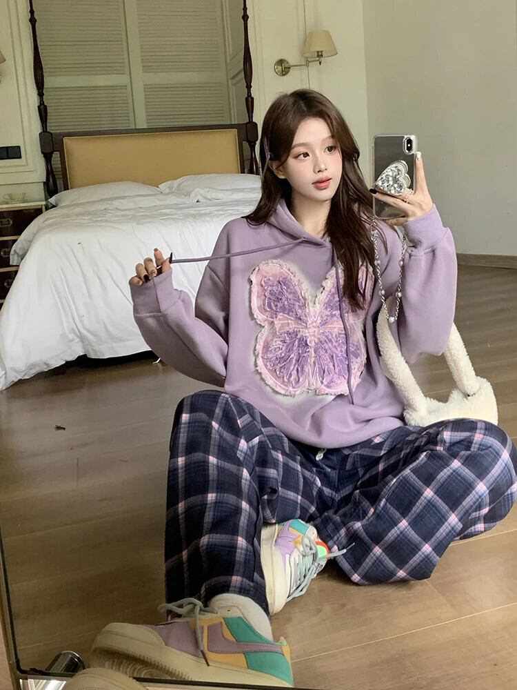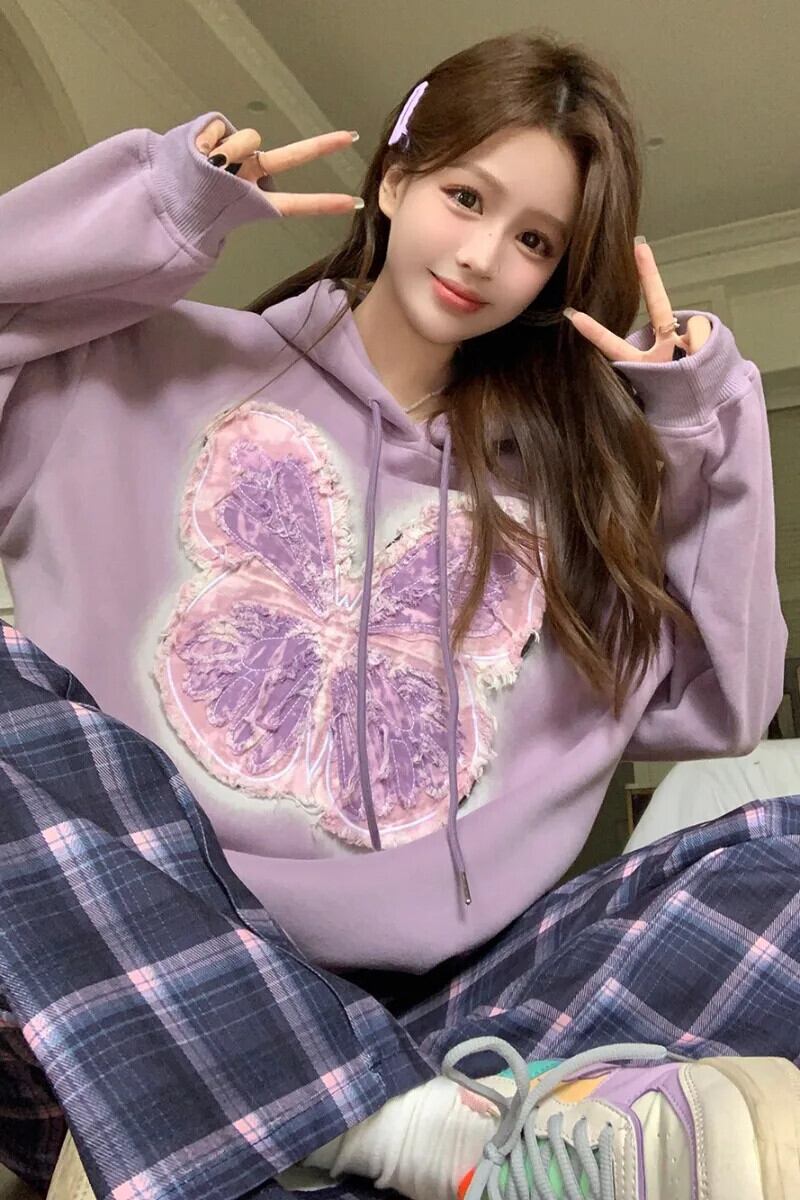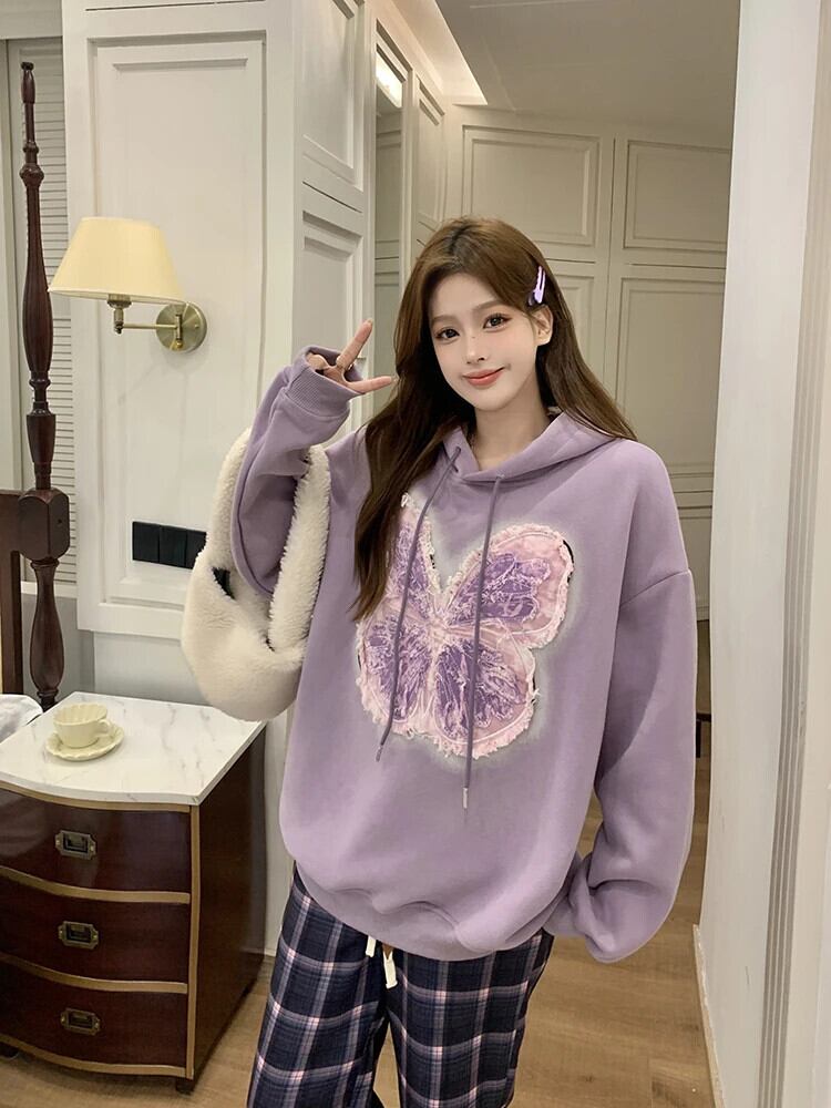 ホットガール蝶刺繍フード付きプルオーバー秋と冬スタイルルーズスウェットシャツ レッド オータム 秋物 ウィンター 冬物