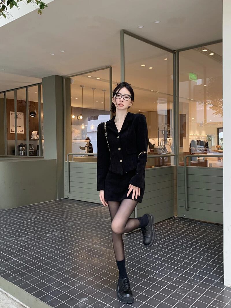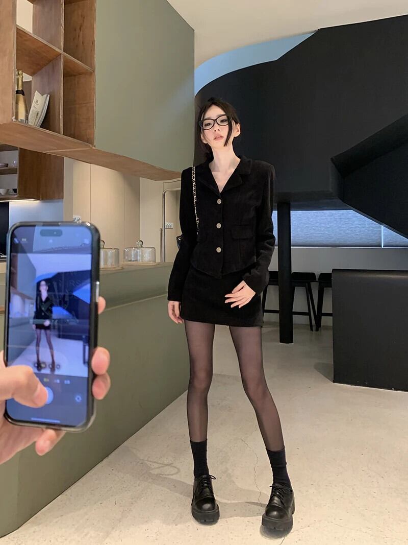 甘いホットガールスーツ冬コーデュロイターンダウン襟コートウエストラップヒップスカートツーピースセット 大人ガーリー スウィート キュート カジュアル ウィンター 冬物