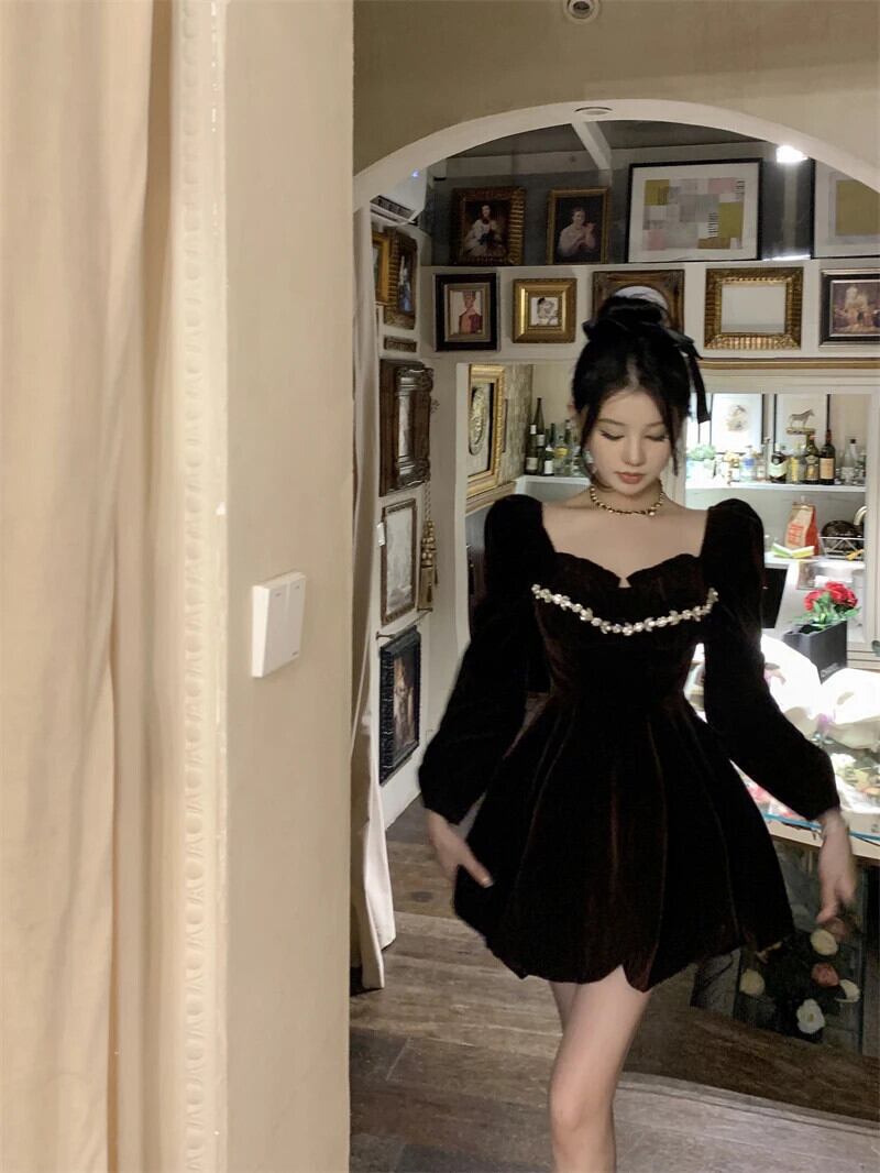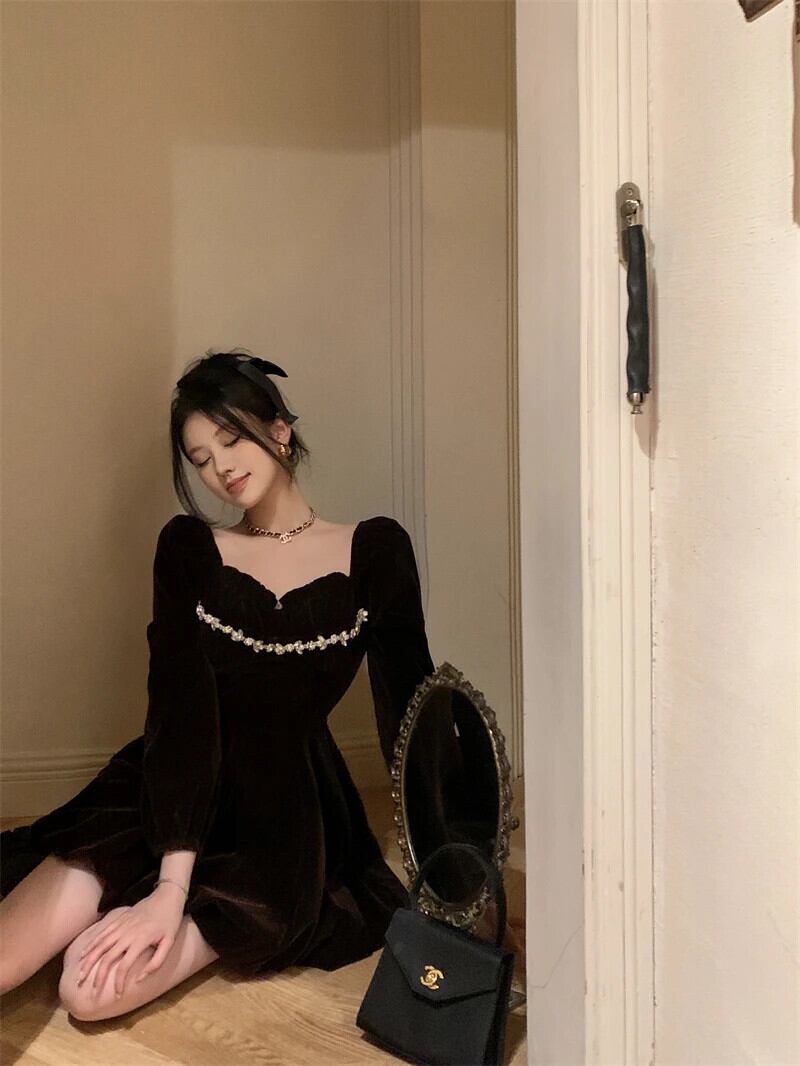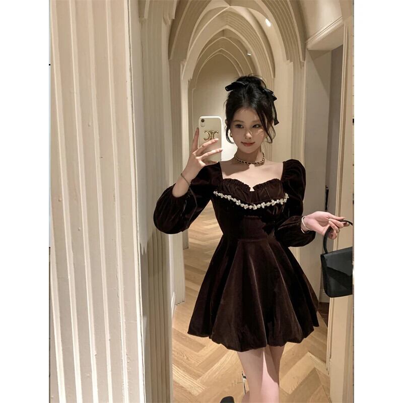 フレンチスタイル甘いホットガールスクエアカラードレス秋/冬コーヒーベルベットショートドレス 大人ガーリー スウィート キュート カジュアル オータム 秋物 ウィンター 冬物 スクウェア
