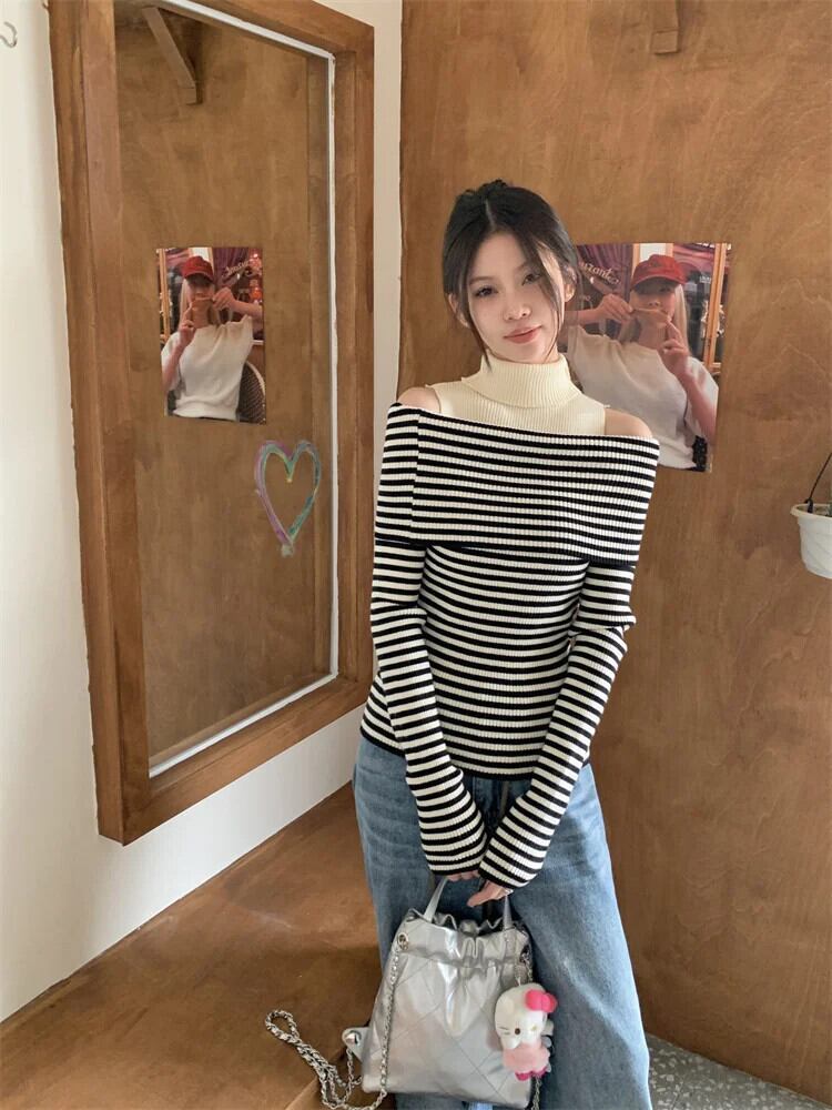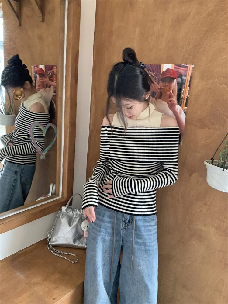 甘いホットガールハーフネックストライプセーター秋スプライス偽ツーピースオフショルダーニット 大人ガーリー スウィート キュート カジュアル オータム 秋物