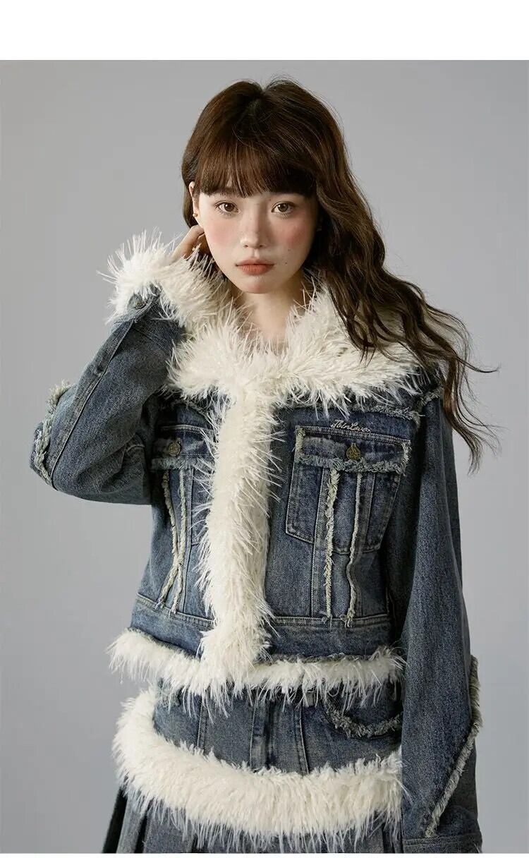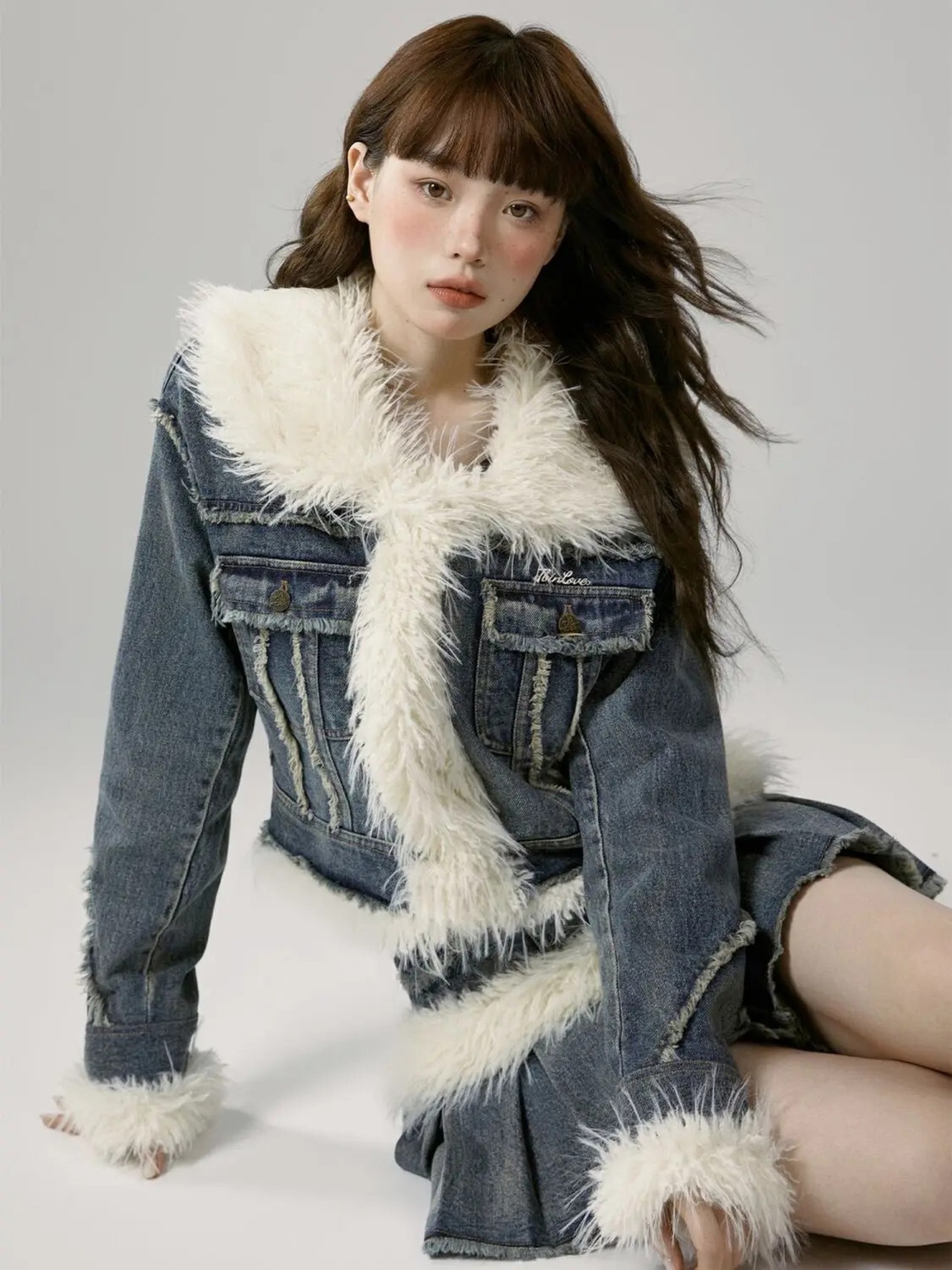 甘いホットガールスーツ冬デニムファー襟コートウエスト A ラインミニスカート 2 点セット 大人ガーリー スウィート キュート カジュアル ウィンター 冬物 Aライン