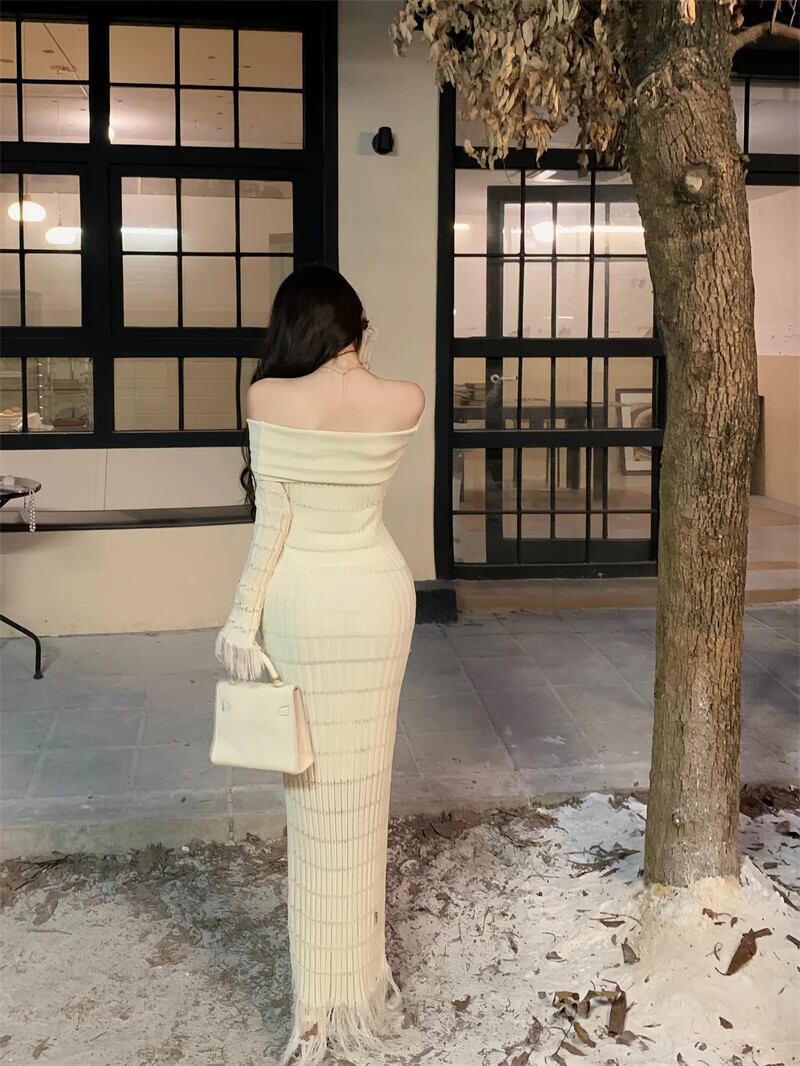 ホットガール純粋セクシースリムフィットドレス秋/冬オフショルダー電話ラップヒップニットドレス オータム 秋物 ウィンター 冬物 ピュア