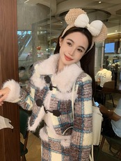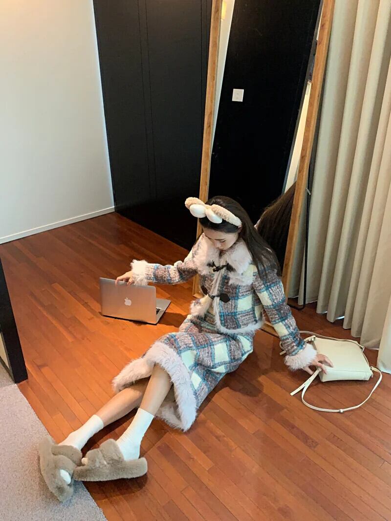 甘いホットガールスーツ秋チェック柄ターンダウン襟ショートコートウエストロングスカートツーピースセット 大人ガーリー スウィート キュート カジュアル オータム 秋物