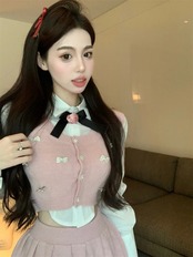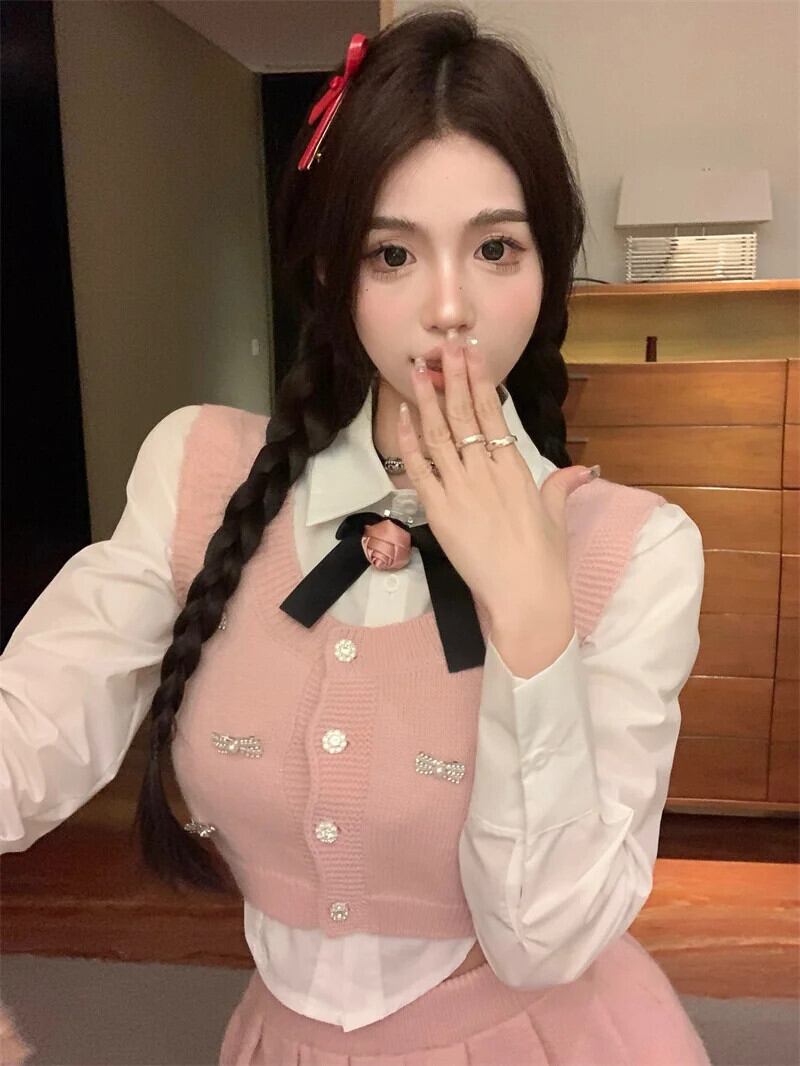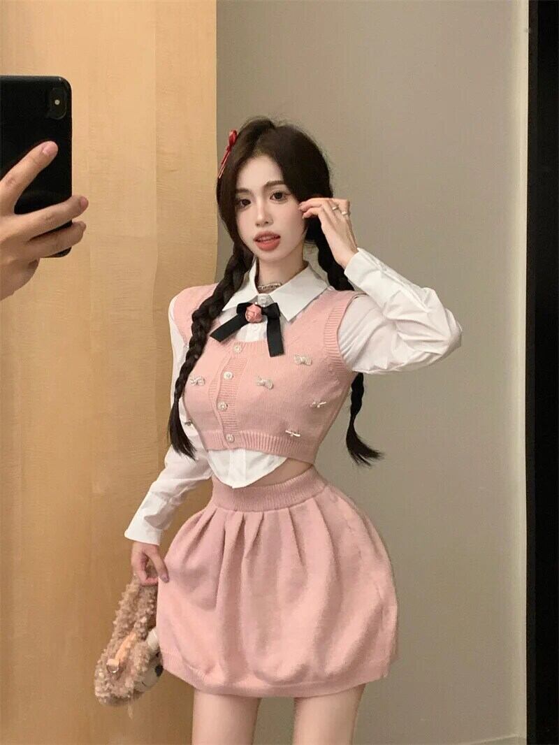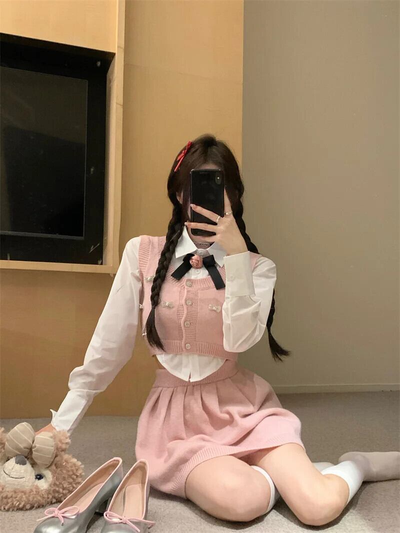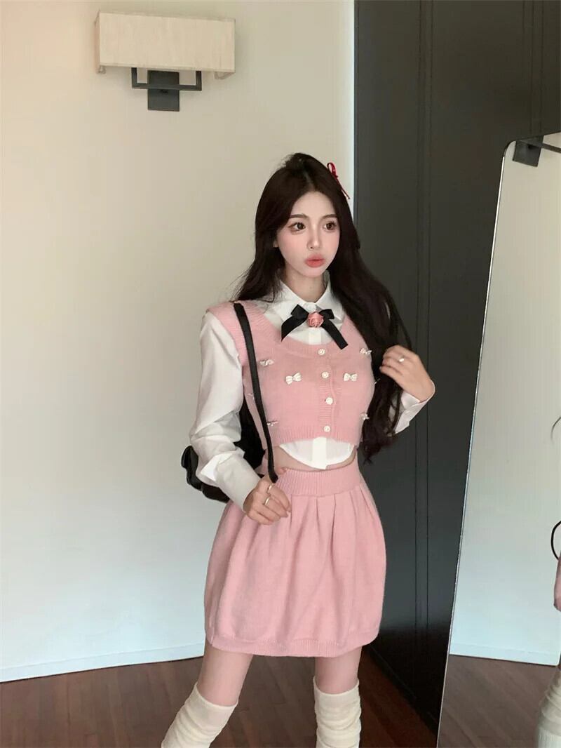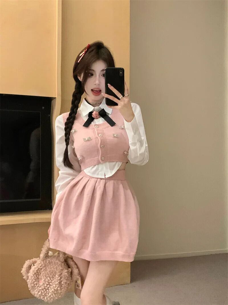 甘いホットガールプレッピースタイルスーツ秋ウエストショートスカートニットベストシャツ 3 点セット 大人ガーリー スウィート キュート カジュアル オータム 秋物