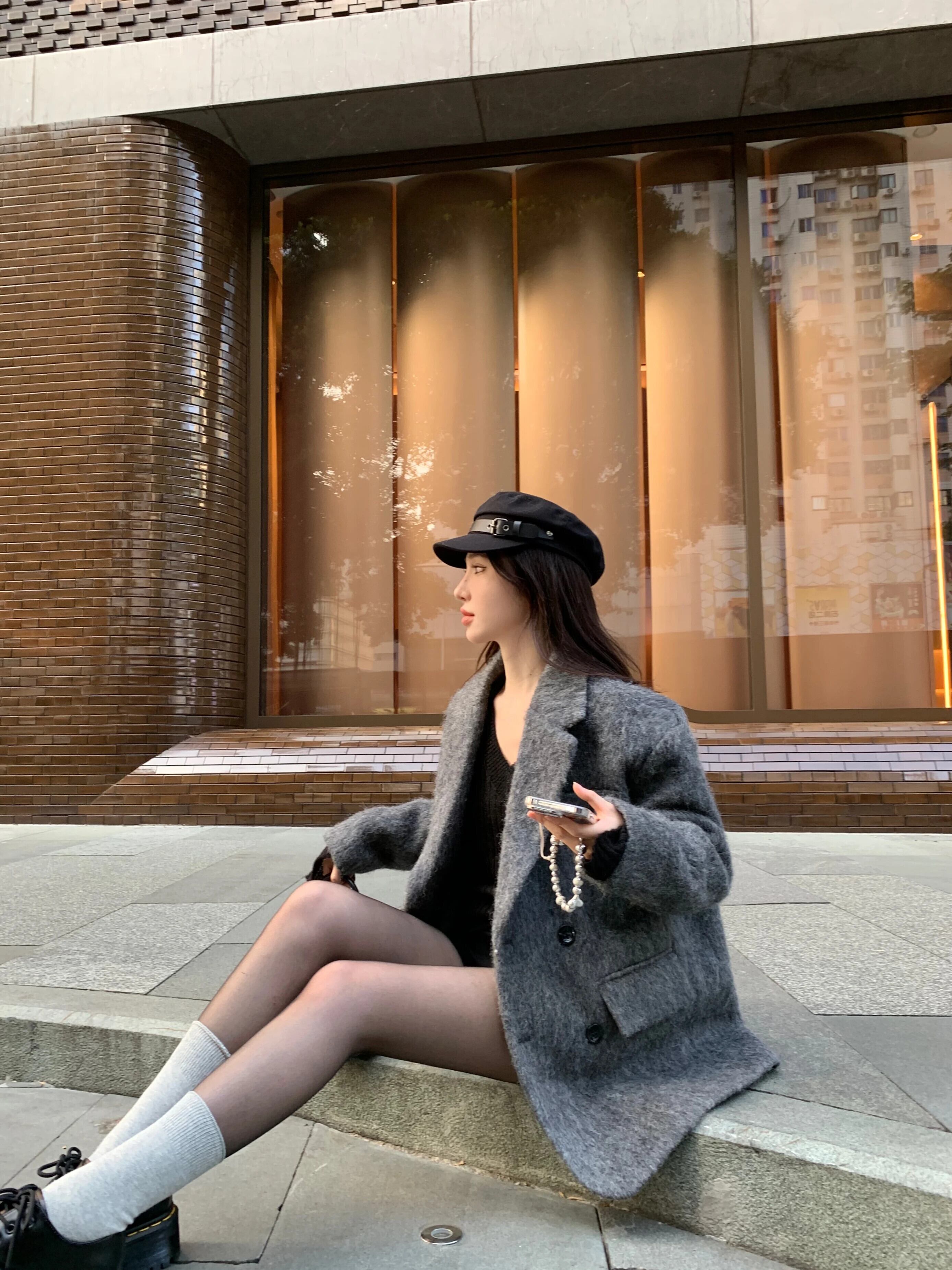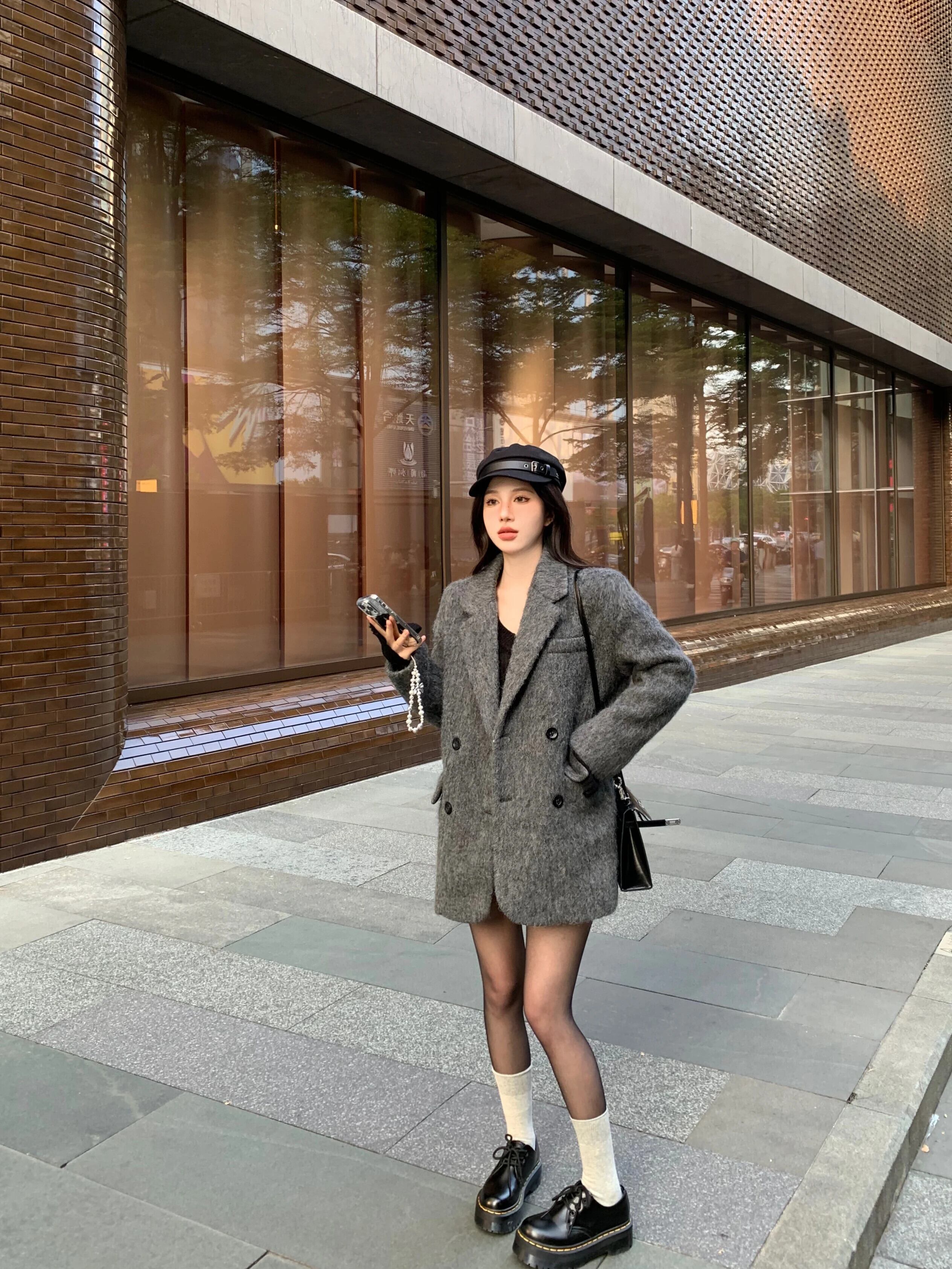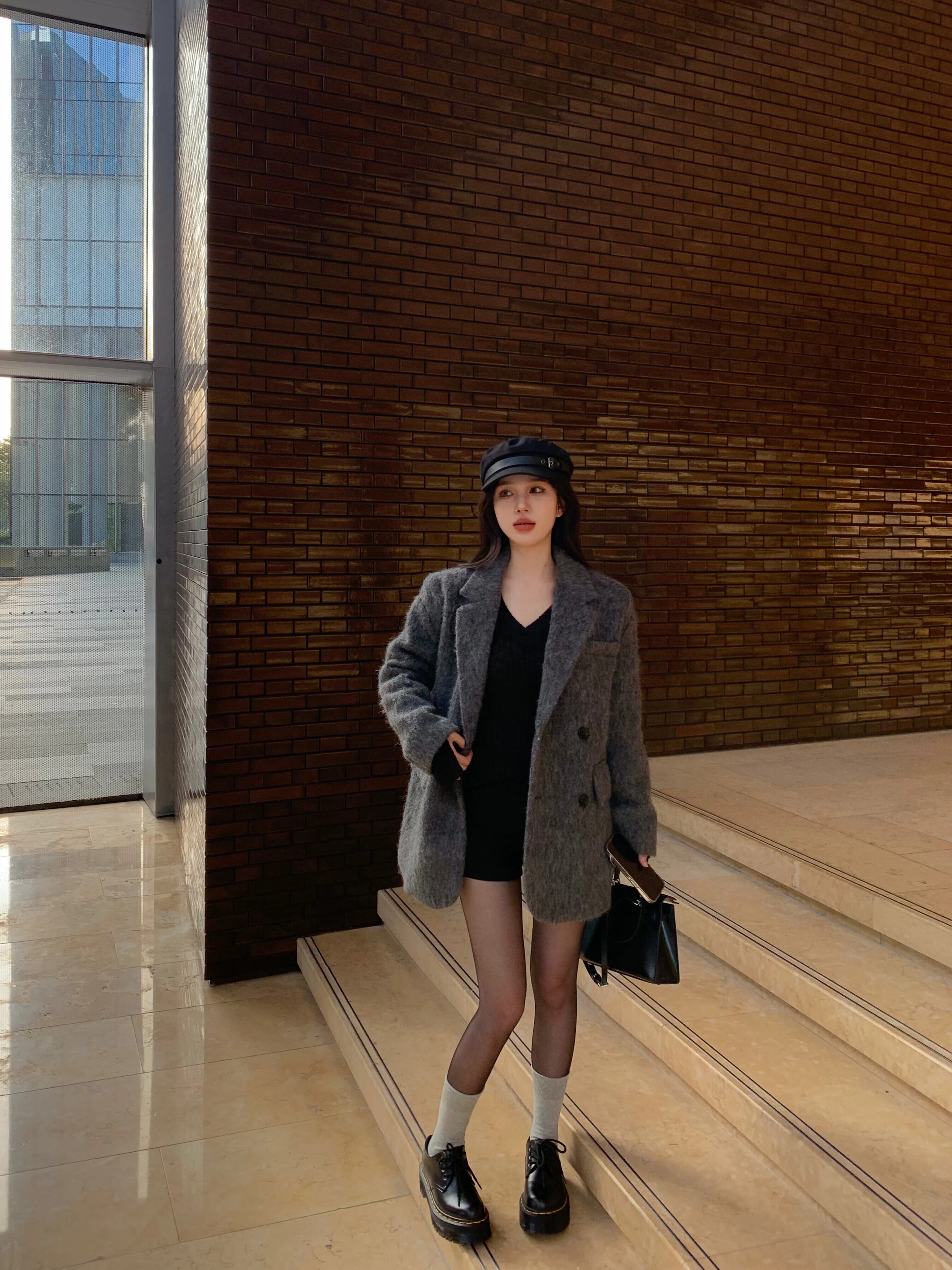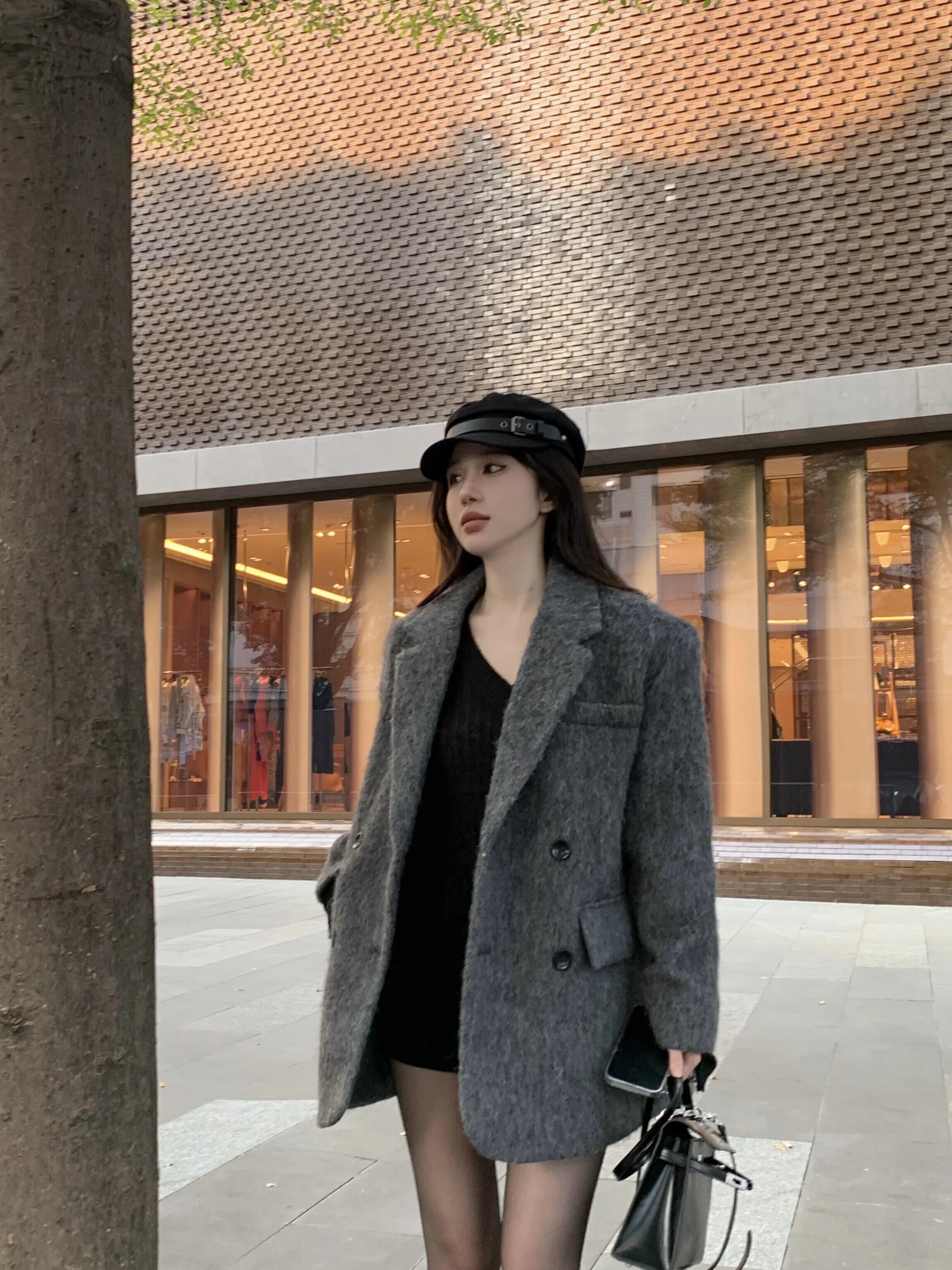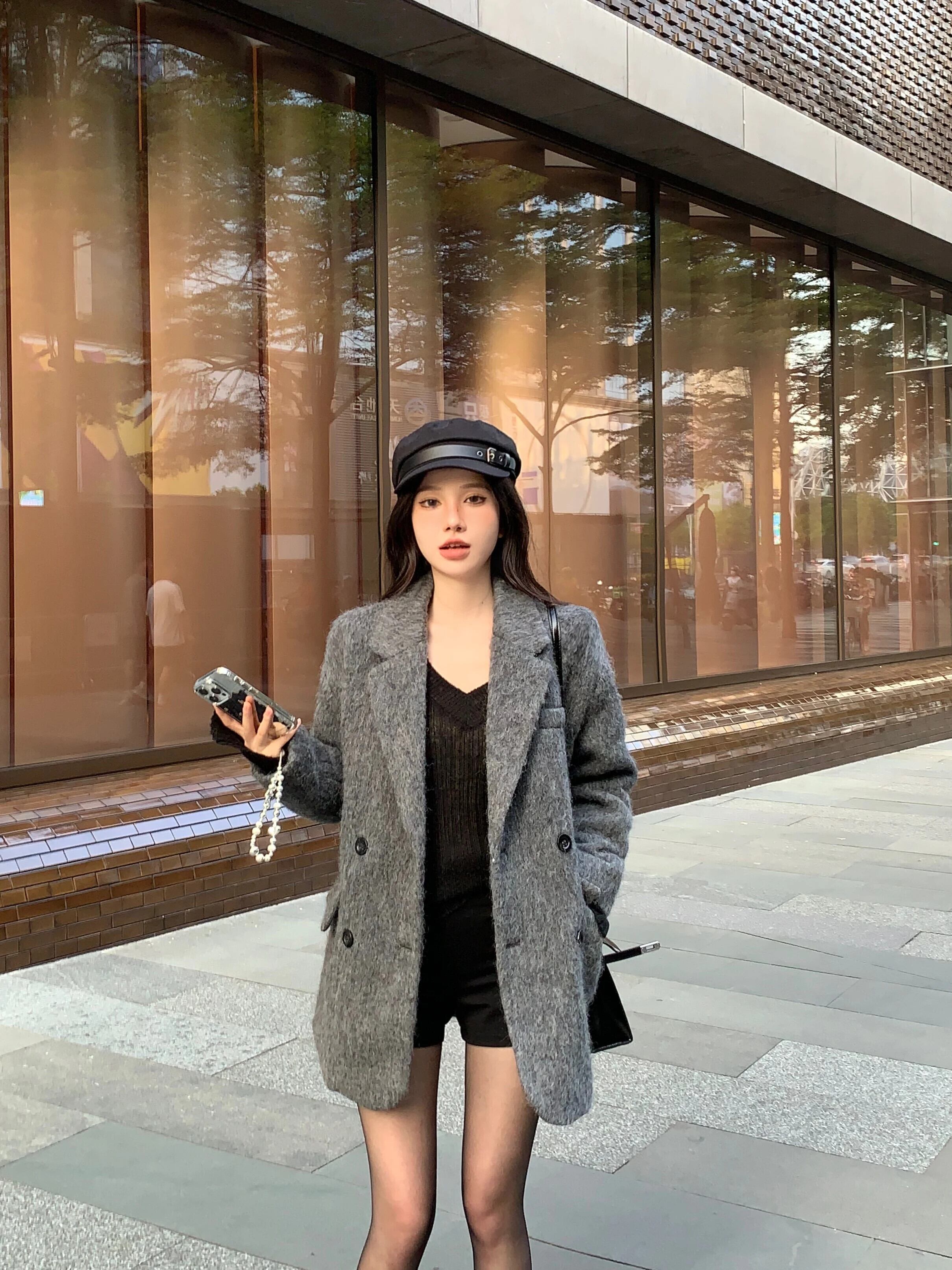 ホットガールグレーウールスーツジャケット冬ルーズフィットショルダーパッドウールテーラードコート レッド ウィンター 冬物