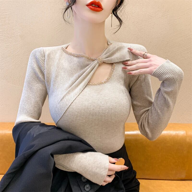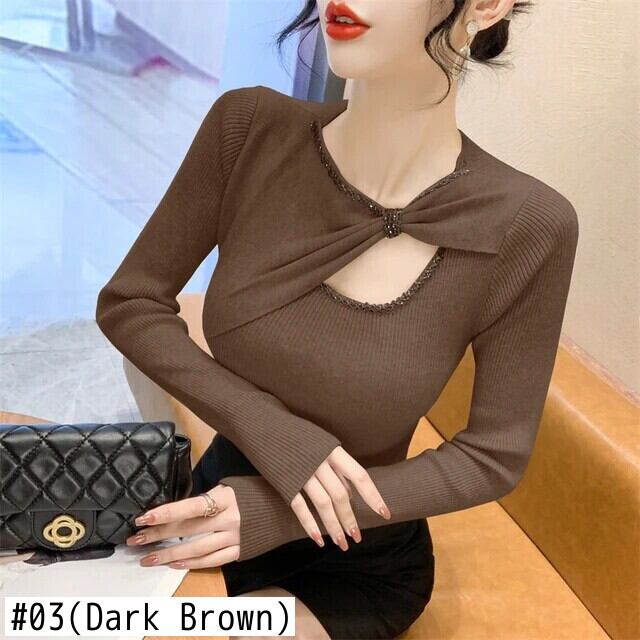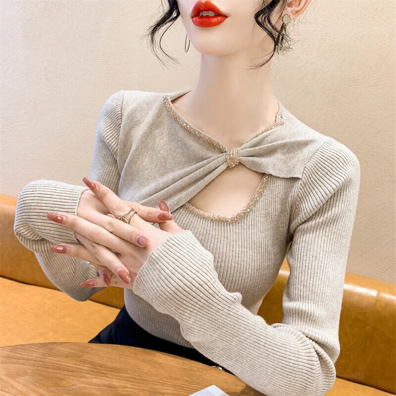 Sweet Girl ビーズダイヤモンド不規則リボンセーター秋ニットプルオーバー底トップ 大人ガーリー スウィート キュート カジュアル オータム 秋物