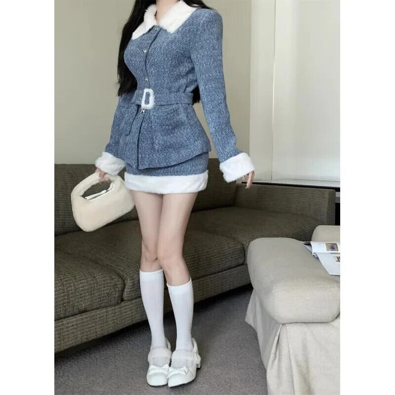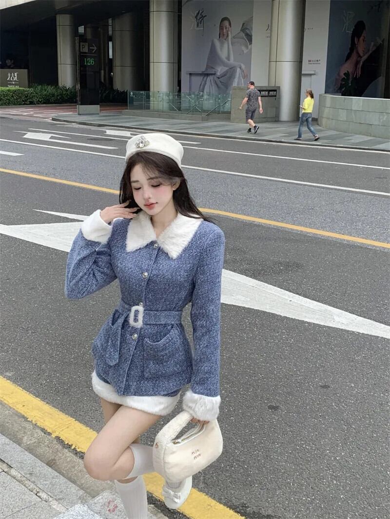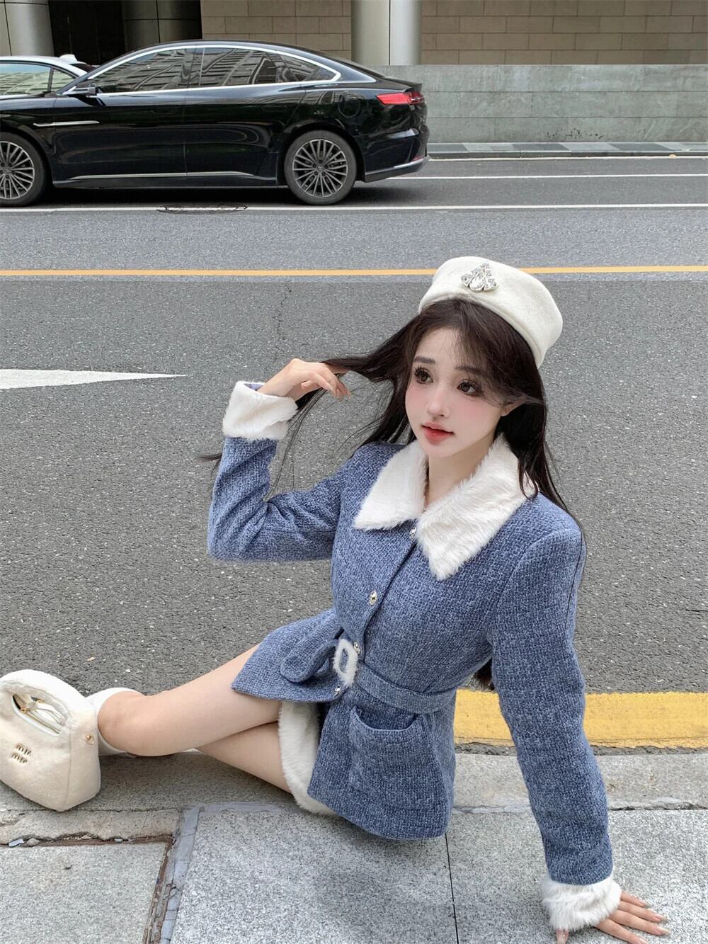 スウィートガールスーツ レディース 秋と冬 ブルーファーカラーパネルコート ウエストミニスカート 2点セット 大人ガーリー キュート カジュアル オータム 秋物 ウィンター 冬物