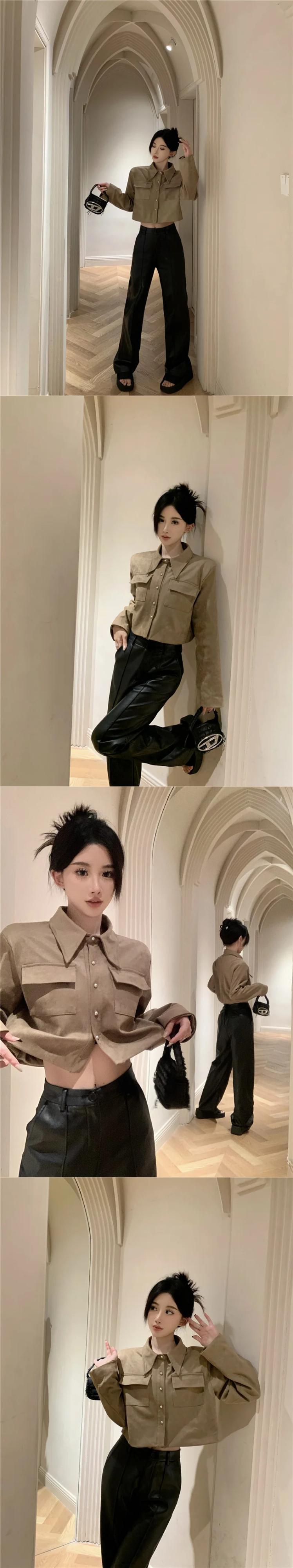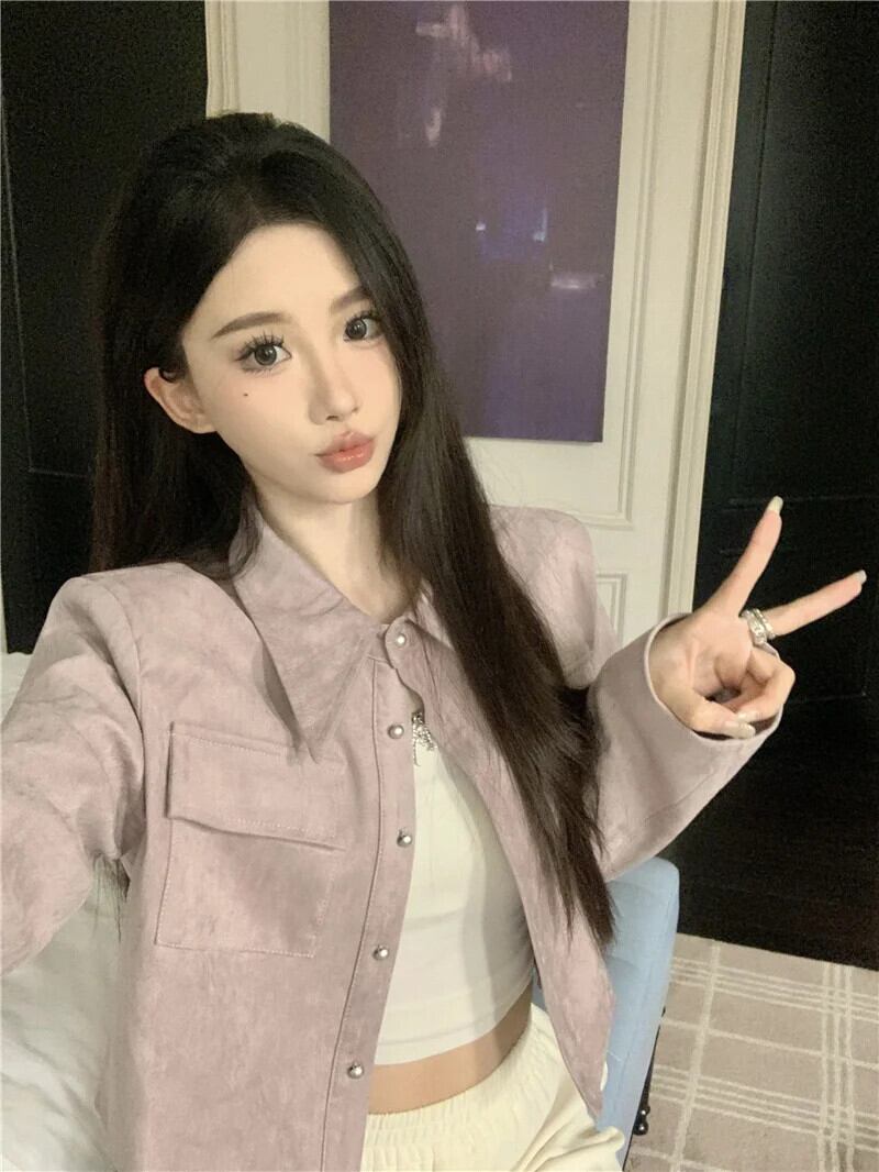 甘いホットガールターンダウン襟スエードショートジャケット秋長袖多用途ジャケットトップ ロング スウェード 大人ガーリー スウィート キュート カジュアル オータム 秋物