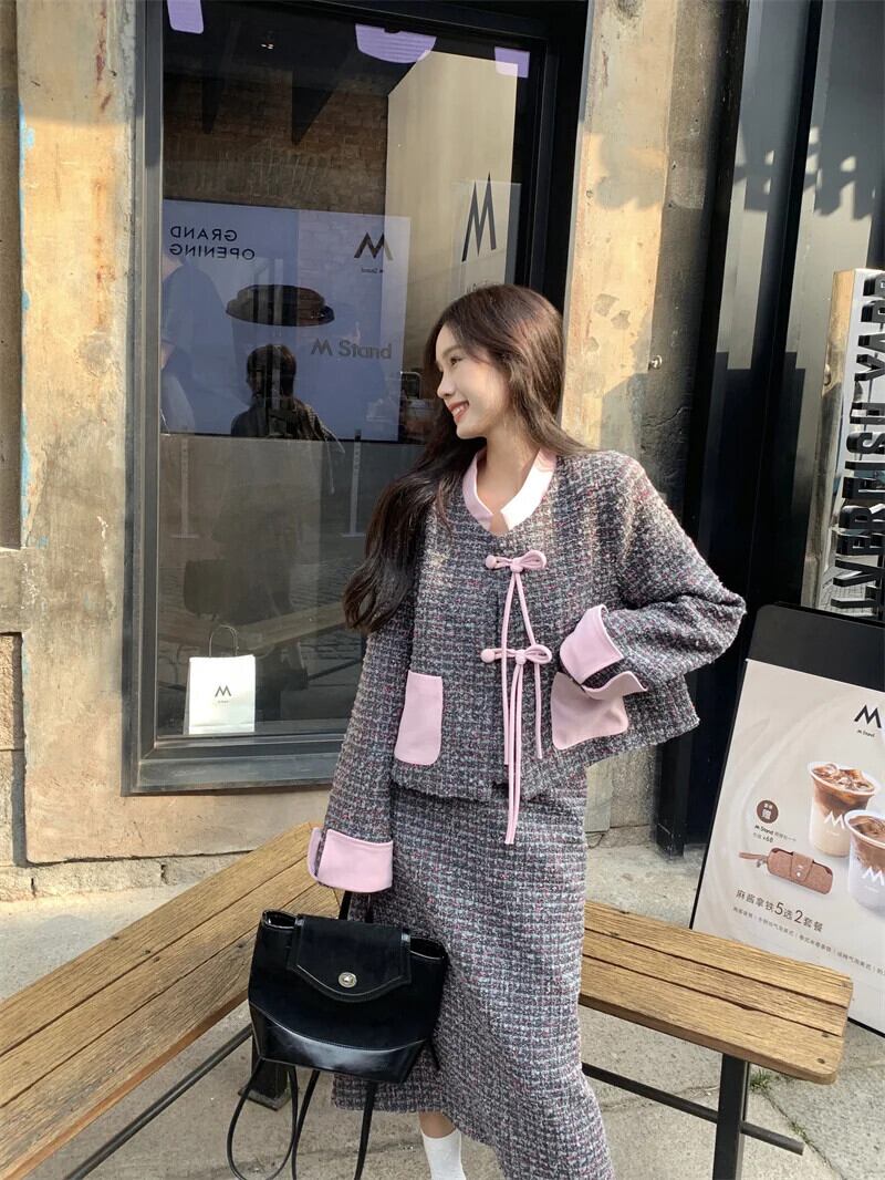 甘い女子中国風レトロスーツ秋/冬ショートボタンコートロングスカートツーピースセットフェムル 大人ガーリー スウィート キュート カジュアル オータム 秋物 ウィンター 冬物