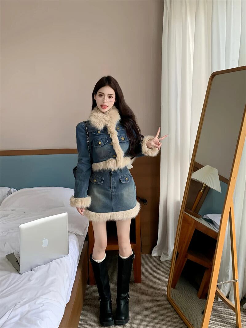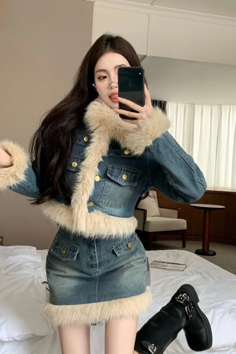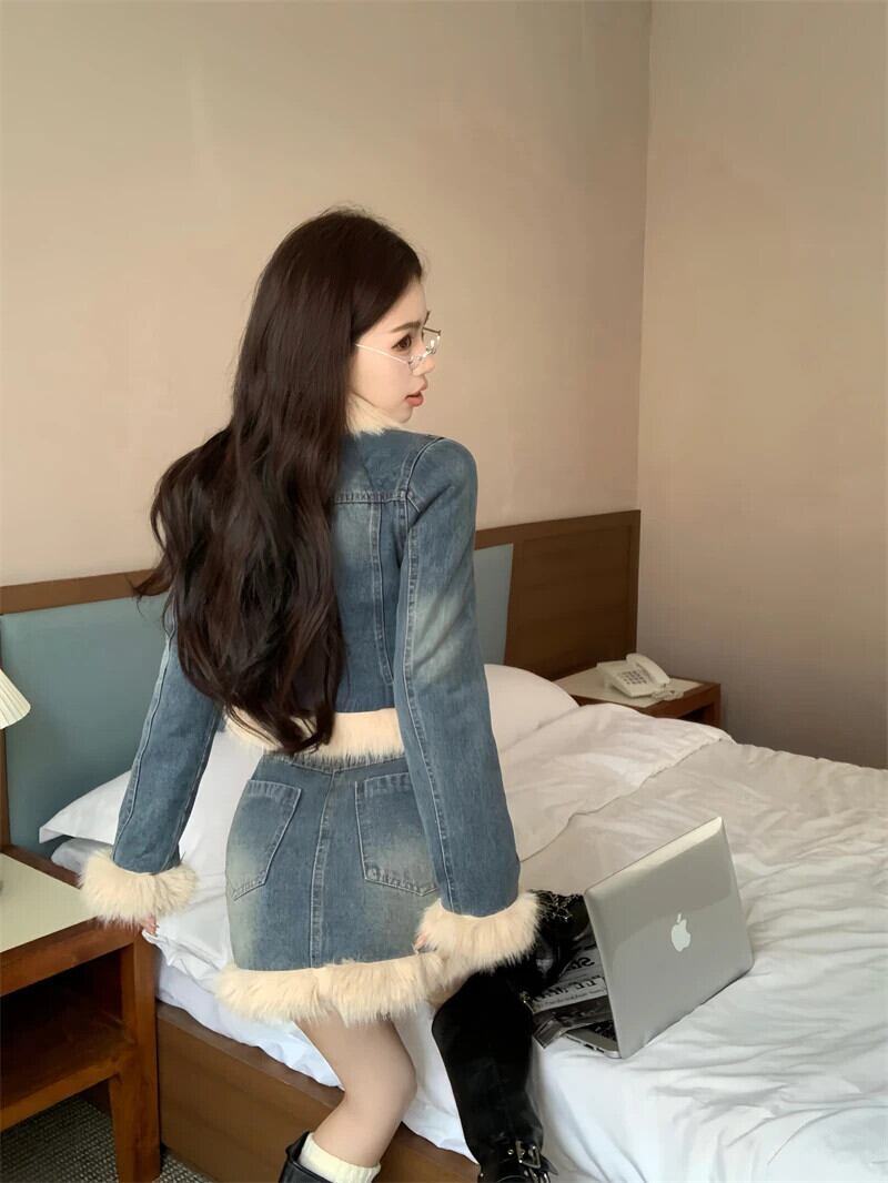 メイラードスタイルホットガールスーツ秋/冬毛皮襟デニムコットンコートラップヒップショートスカート 2 点セット オータム 秋物 ウィンター 冬物