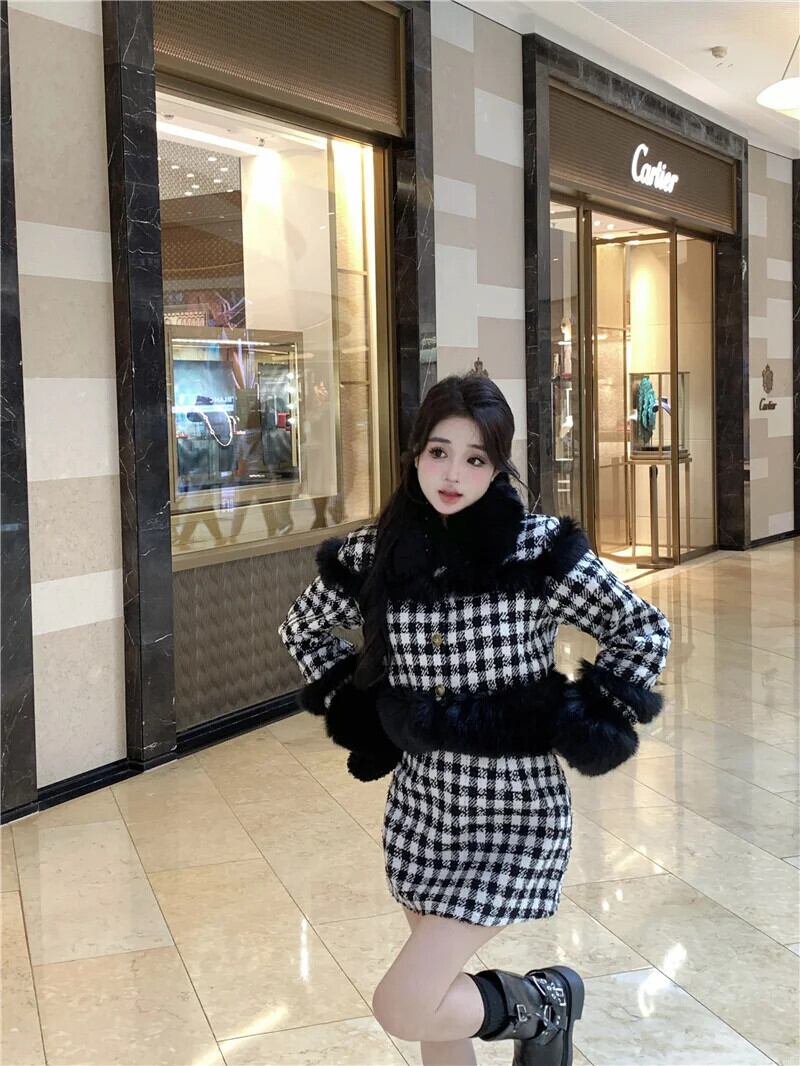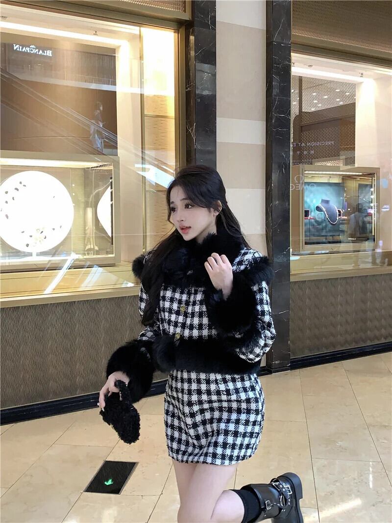 甘いホットガールスーツ秋/冬フェイクファーパッチワークショートチェック柄ジャケットウエストミニスカート 2 点セット 大人ガーリー スウィート キュート カジュアル オータム 秋物 ウィンター 冬物