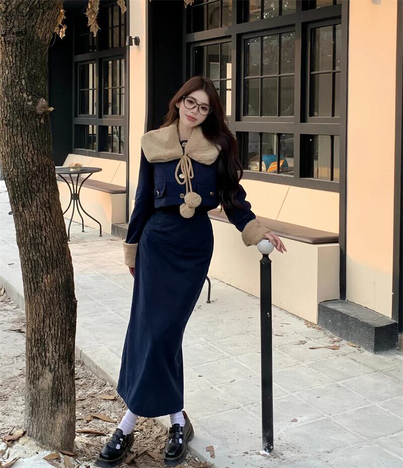 Sweet Girl レトロスーツ秋毛皮スプライシングポロカラーコートウエストラップヒップロングスカート 2 点セット 大人ガーリー スウィート キュート カジュアル オータム 秋物