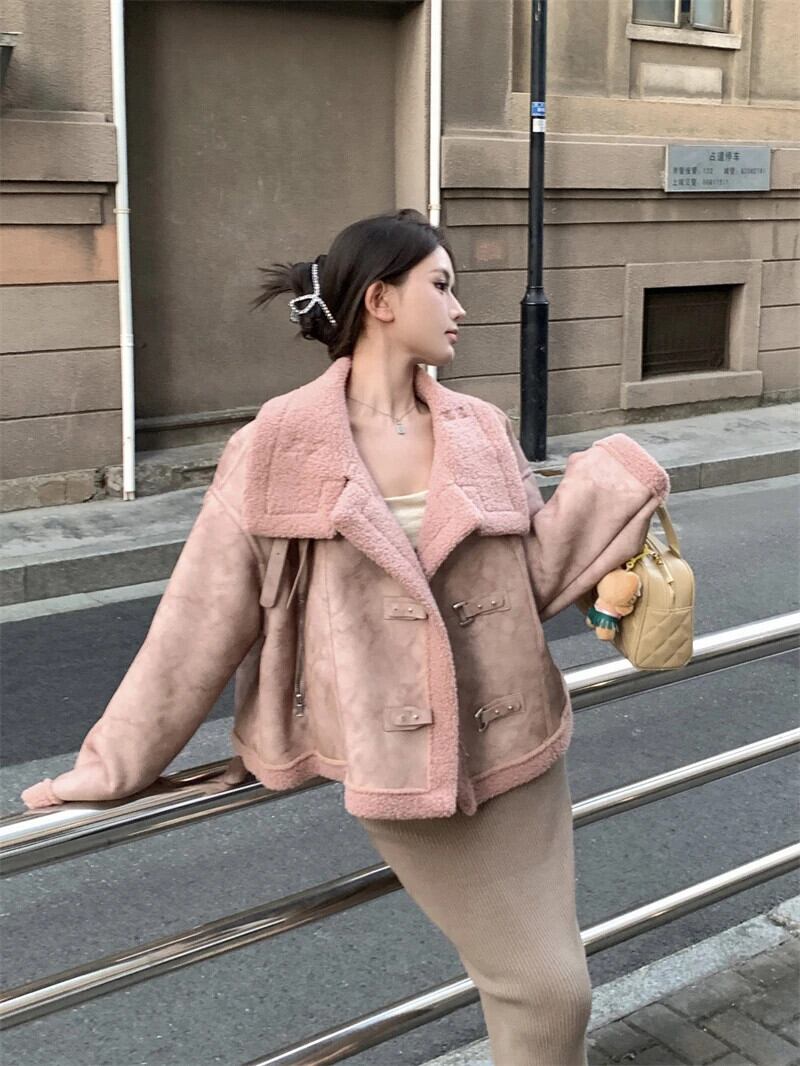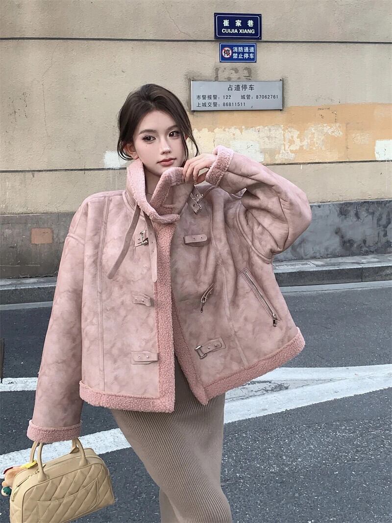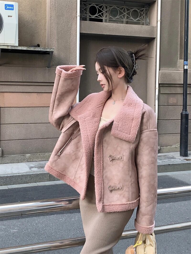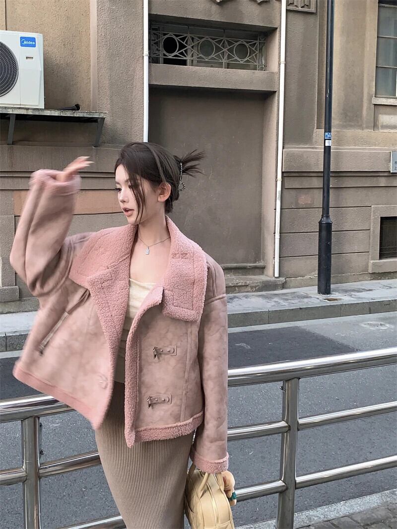 甘いホットガールラムウールスタンドカラージャケット秋と冬厚いスエードルーズ長袖コート ロング スウェード 大人ガーリー スウィート キュート カジュアル オータム 秋物 ウィンター 冬物
