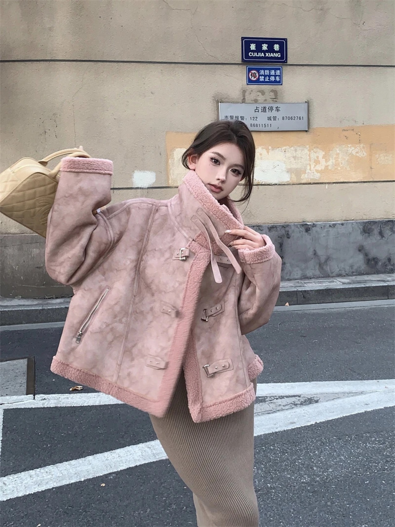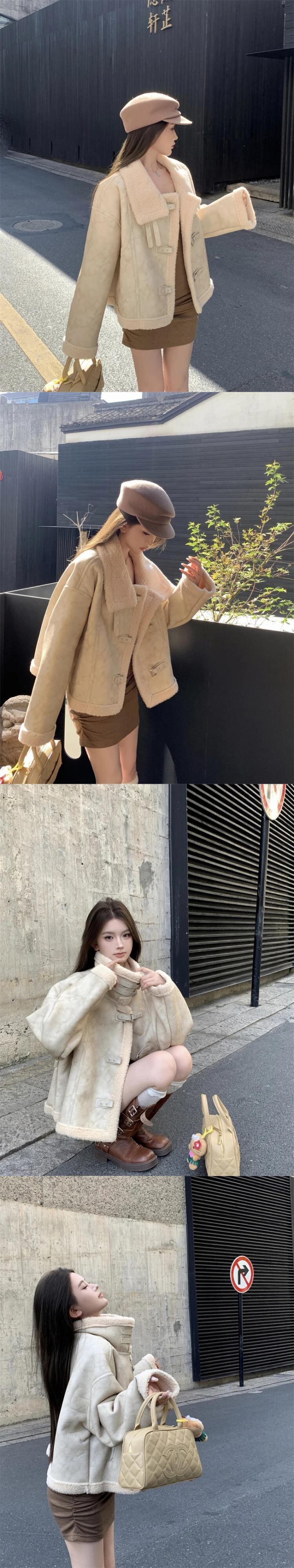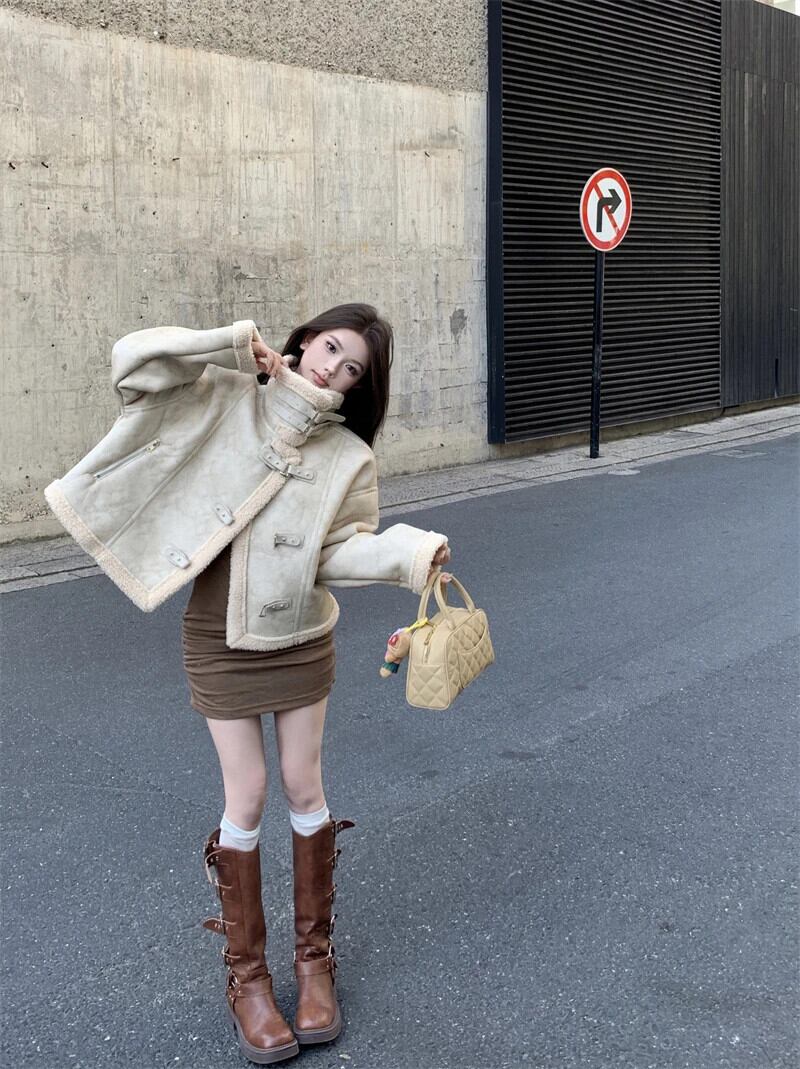 甘いホットガールラムウールスタンドカラージャケット秋と冬厚いスエードルーズ長袖コート ロング スウェード 大人ガーリー スウィート キュート カジュアル オータム 秋物 ウィンター 冬物