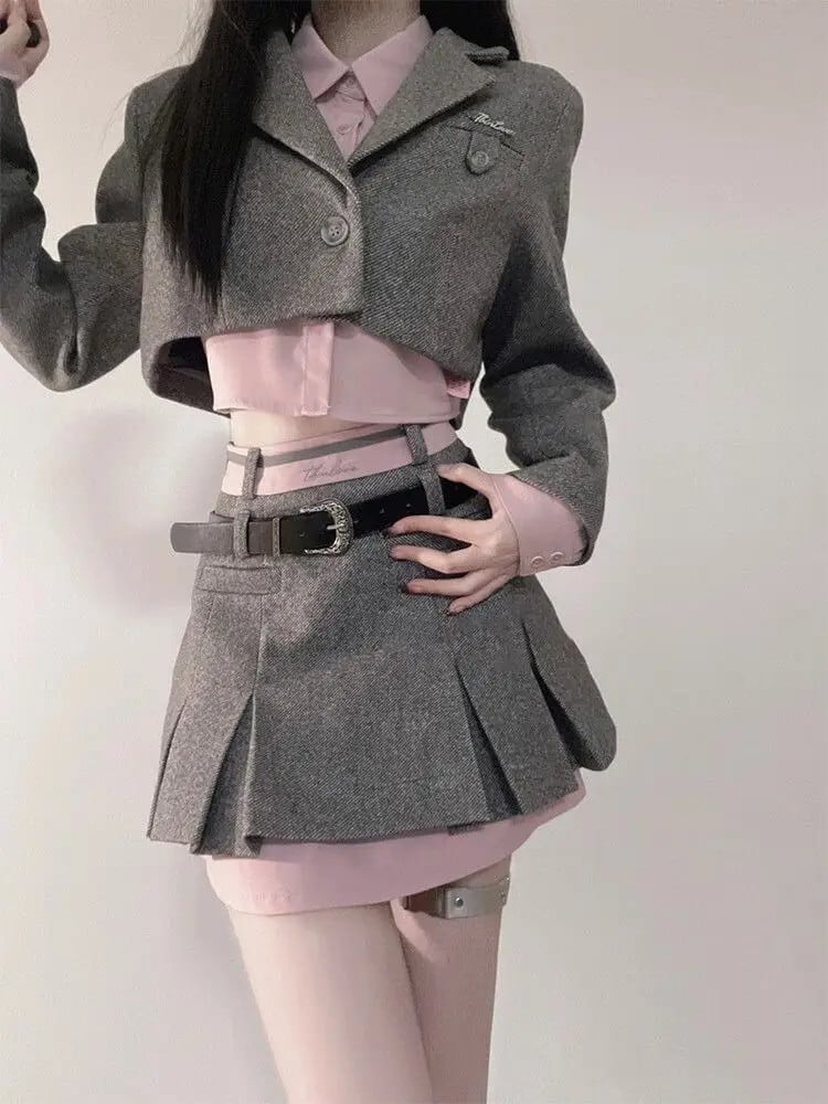 Sweet Girl 純粋セクシースーツ秋コントラストピンクショートコートポロネックシャツプリーツスカート 3 点セット 大人ガーリー スウィート キュート カジュアル オータム 秋物 Oネック ピュア