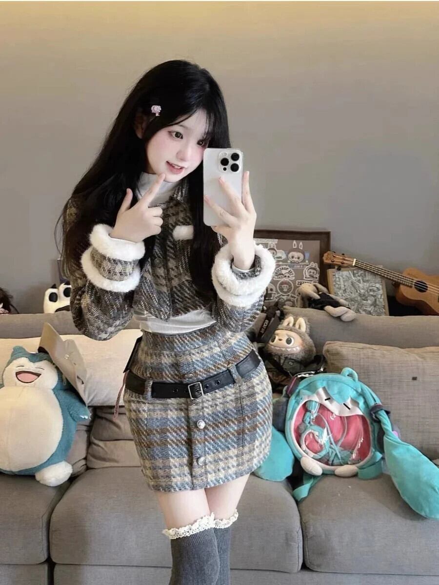 Sweet Girl かわいいスーツ秋チェック柄コントラストファーコートウエストミニスカート 2 点セット 大人ガーリー スウィート キュート カジュアル オータム 秋物