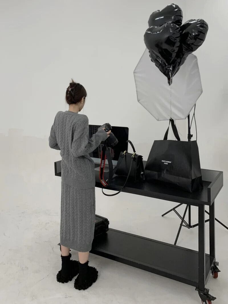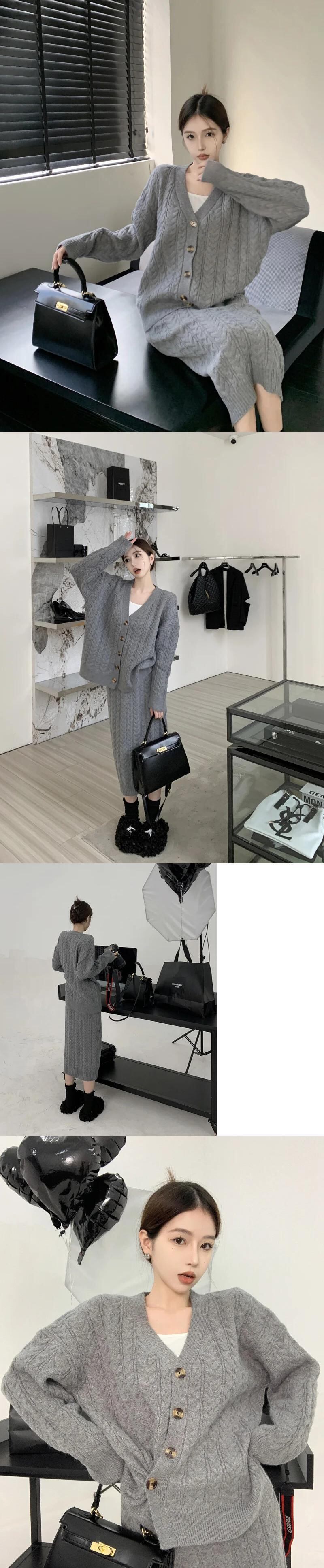 Sweet Girl レトロスーツ秋と冬ツイスト V ネックニットカーディガンラップヒップスカートツーピーススカート 大人ガーリー スウィート キュート カジュアル オータム 秋物 ウィンター 冬物 Vネック