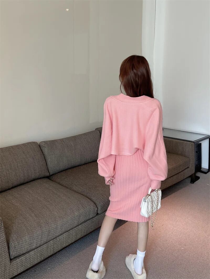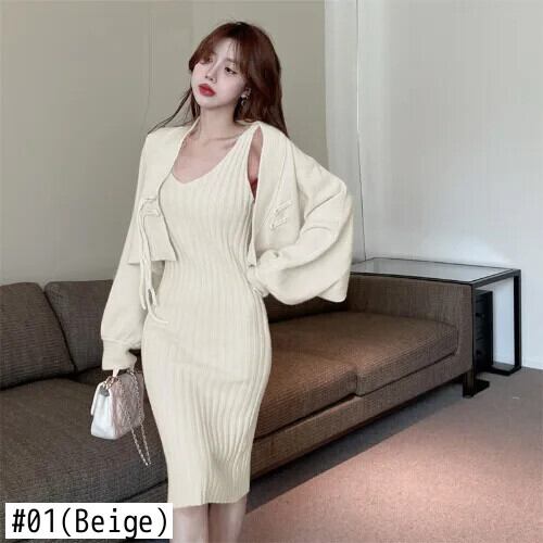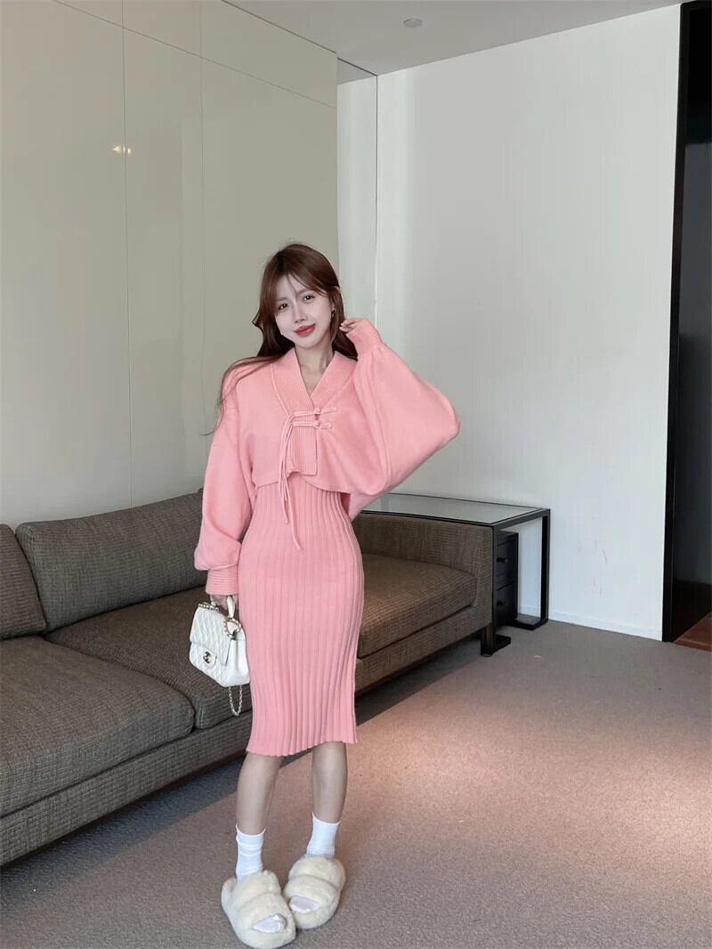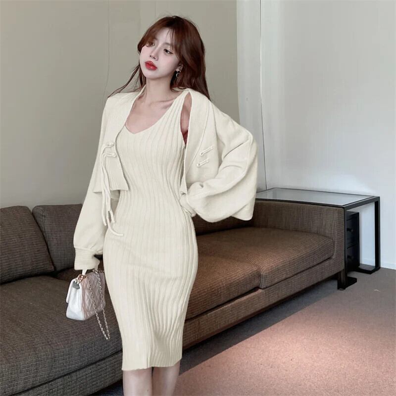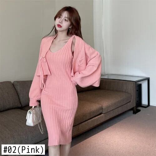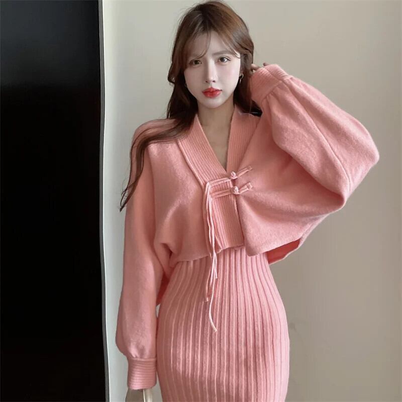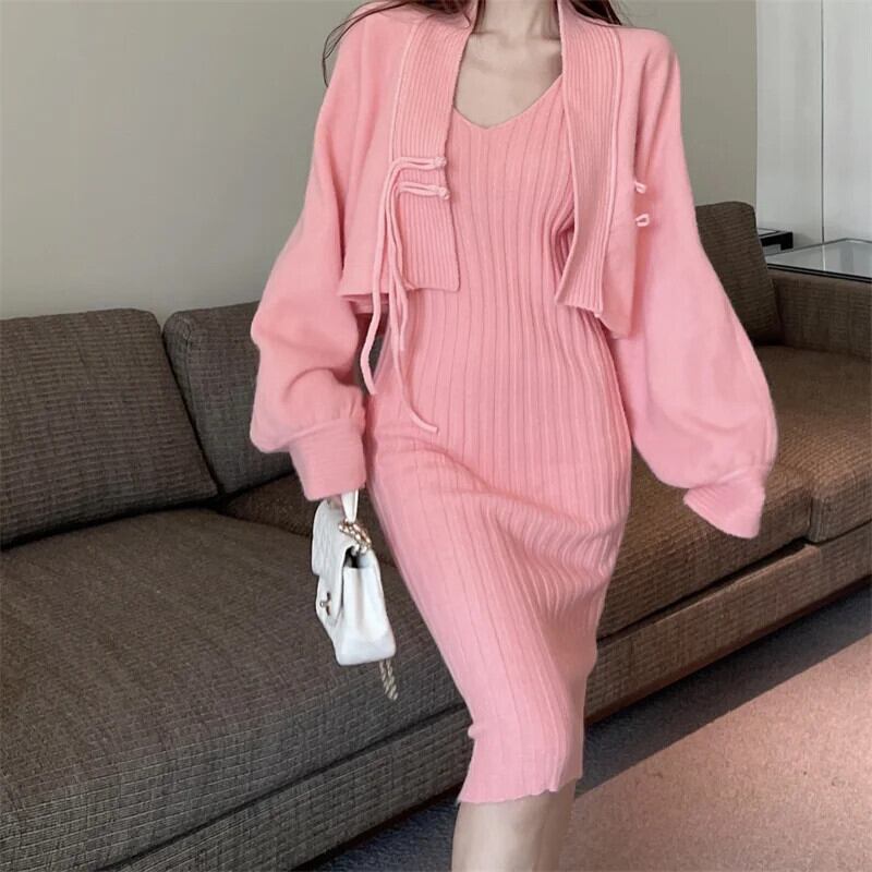 フレンチスイートホットガールスーツ秋/冬チャイナノットニットカーディガンストラップドレスツーピースセット 大人ガーリー スウィート キュート カジュアル オータム 秋物 ウィンター 冬物