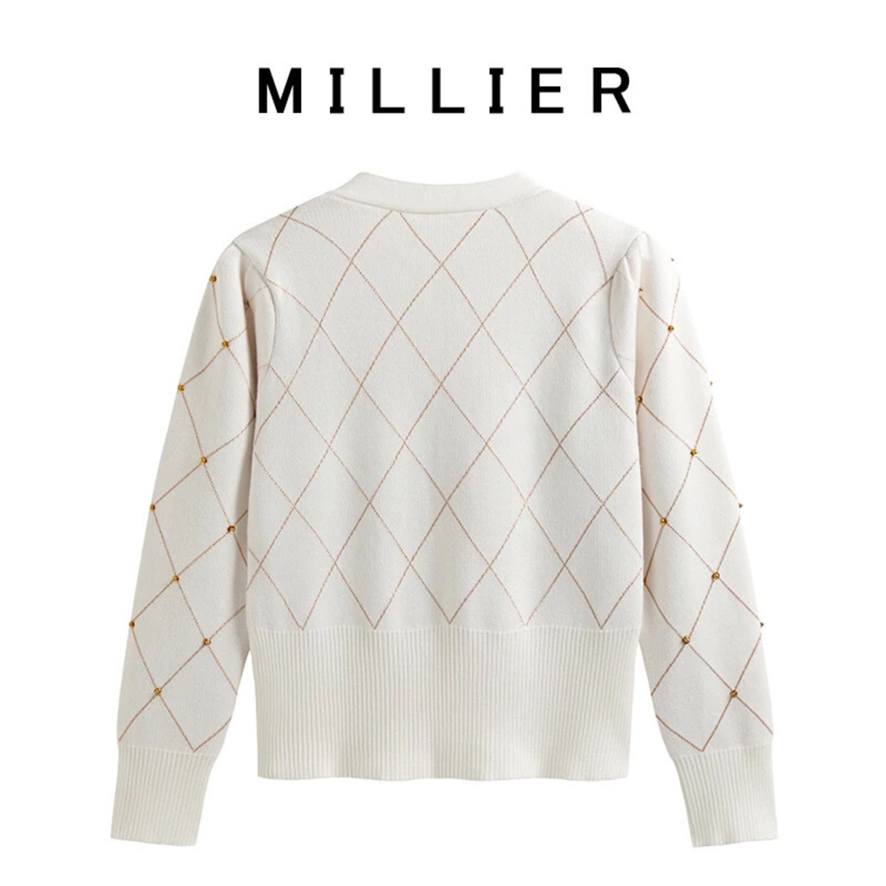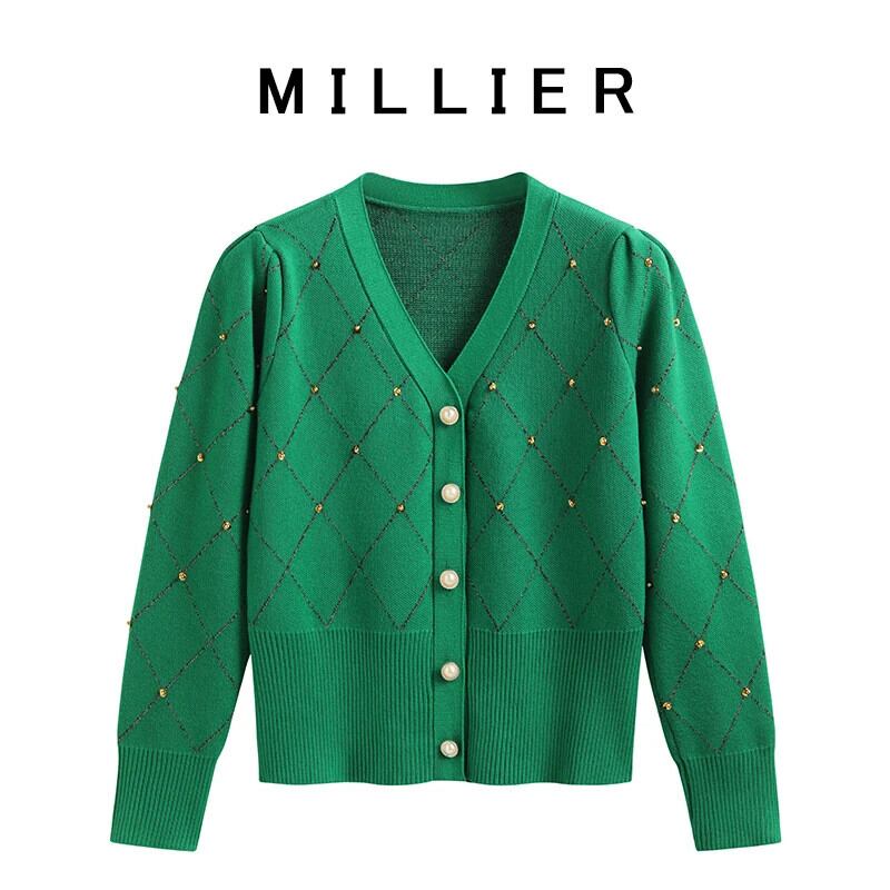 菱形格子ニットカーディガン春と秋ビーズ V ネックシングルブレスト長袖セーター ロング スプリング 春物 オータム 秋物 Vネック