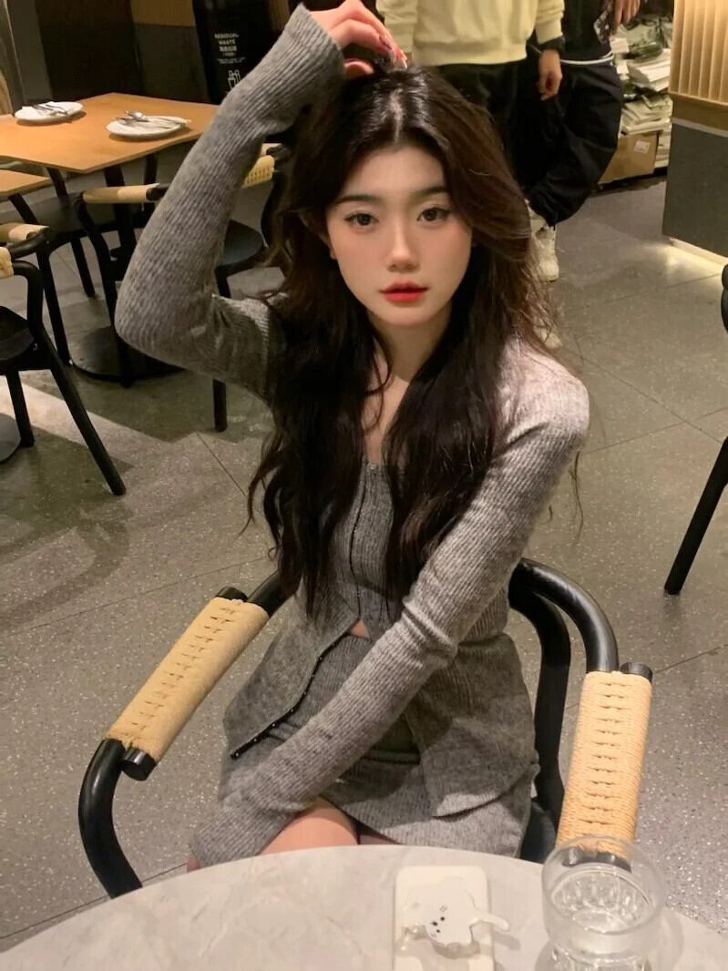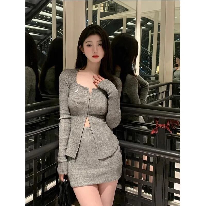 フレンチスイートガールニットスーツ秋スリムフィット長袖シングルブレストトップラップヒップショートスカートツーピースセット ロング 大人ガーリー スウィート キュート カジュアル オータム 秋物